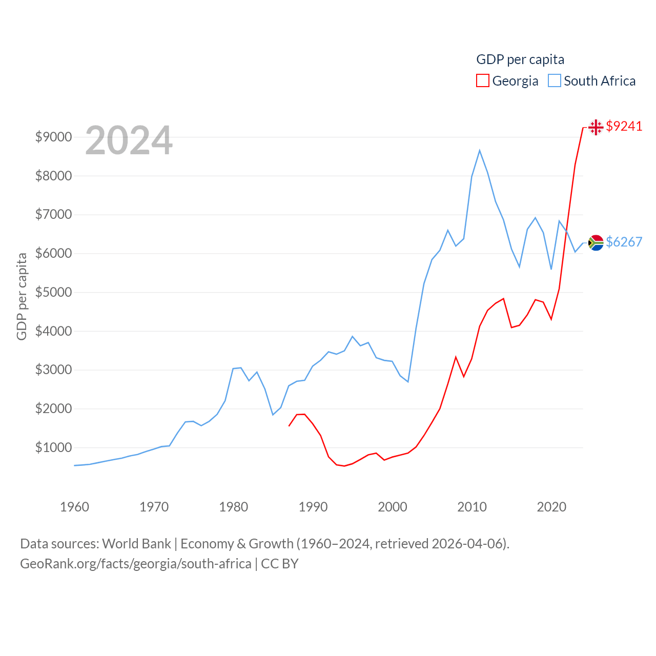 By GDP, Georgia ranks 107/197 ($34.2B) and South Africa ranks 40/197 ($401B). By GDP per capita, Georgia ranks 89/197 ($9,241), while South Africa ranks 111/197 ($6,267).