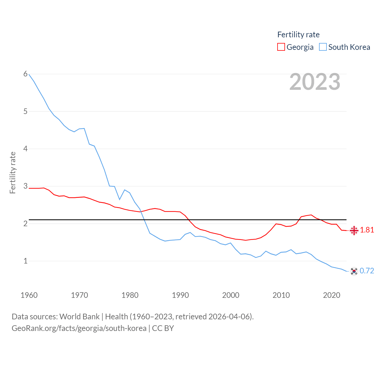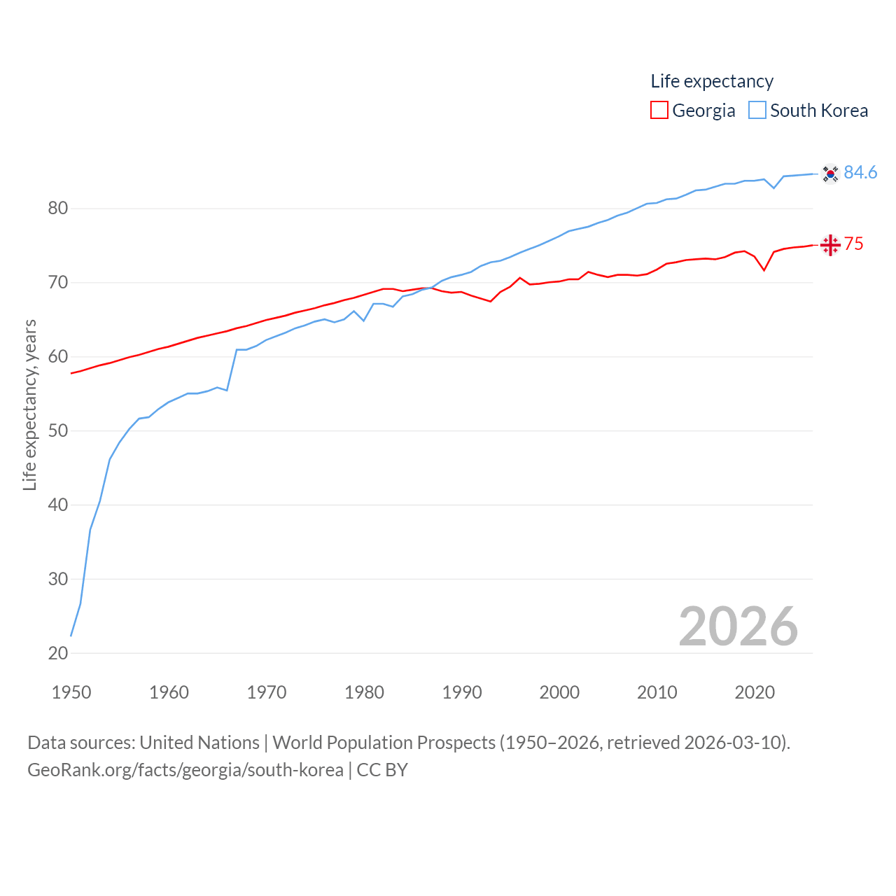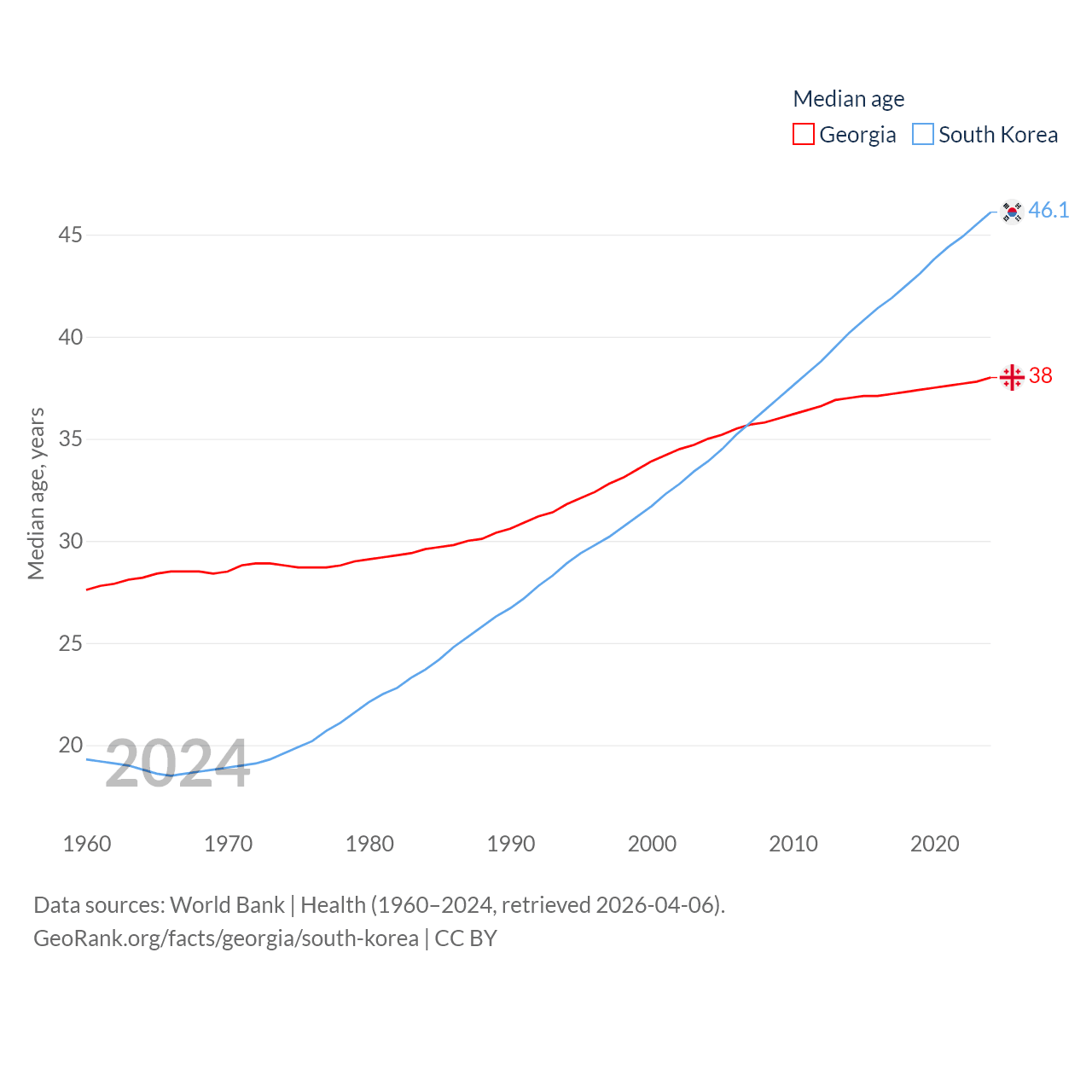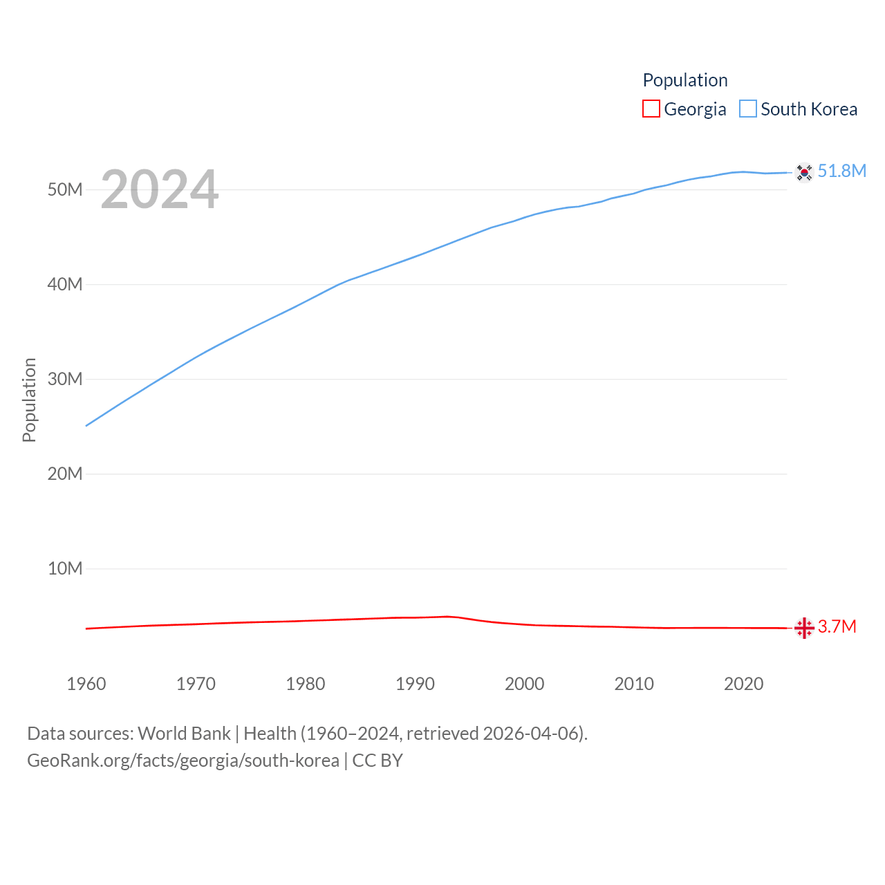 Georgia has a population of 3.7M (ranked 130/197), compared with 51.8M in South Korea (ranked 29/197). Georgia's land area is 26,830 sq mi versus 37,684 sq mi for South Korea (ranked 118th vs. 105th).