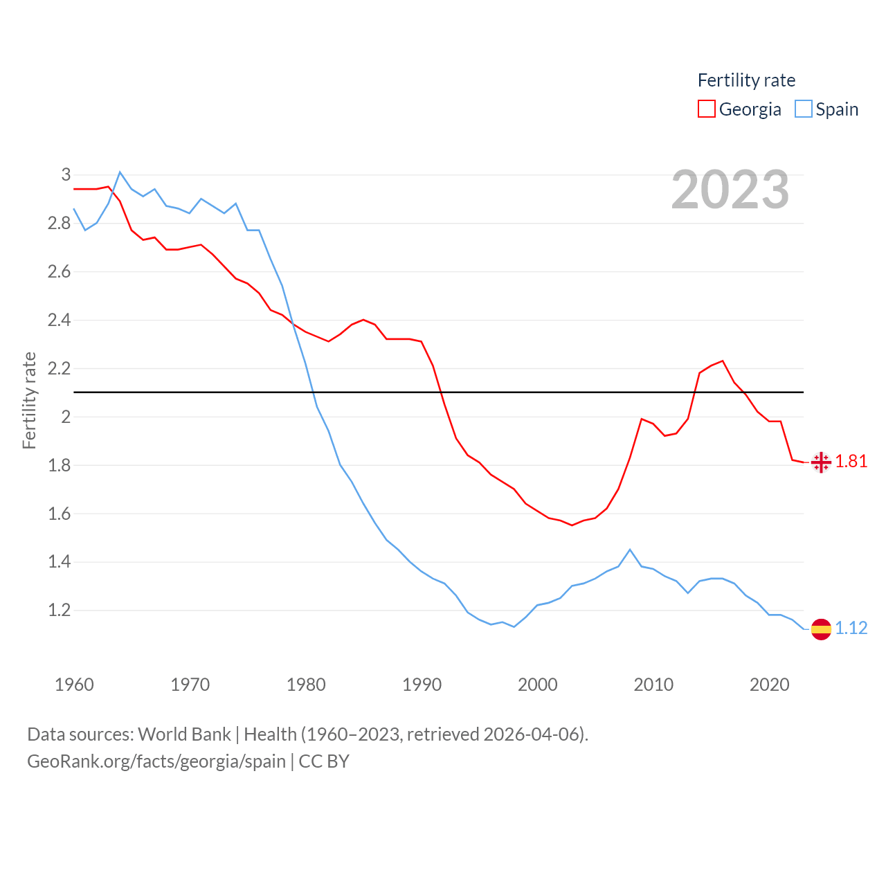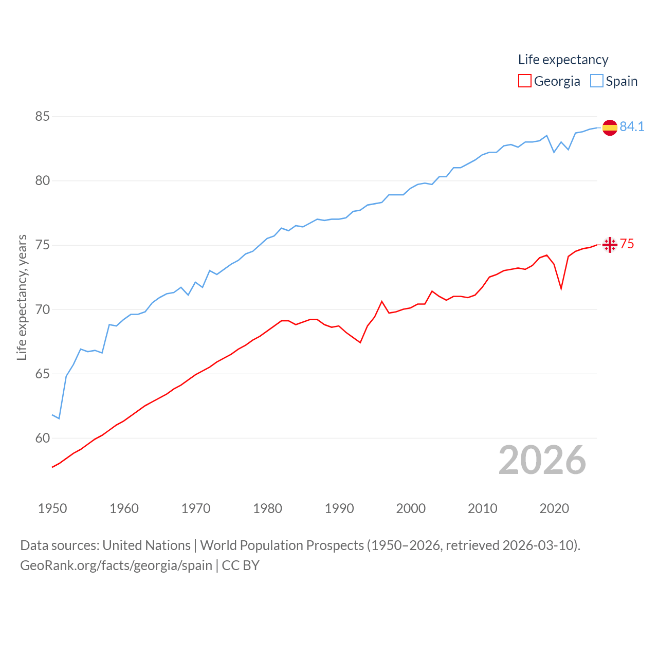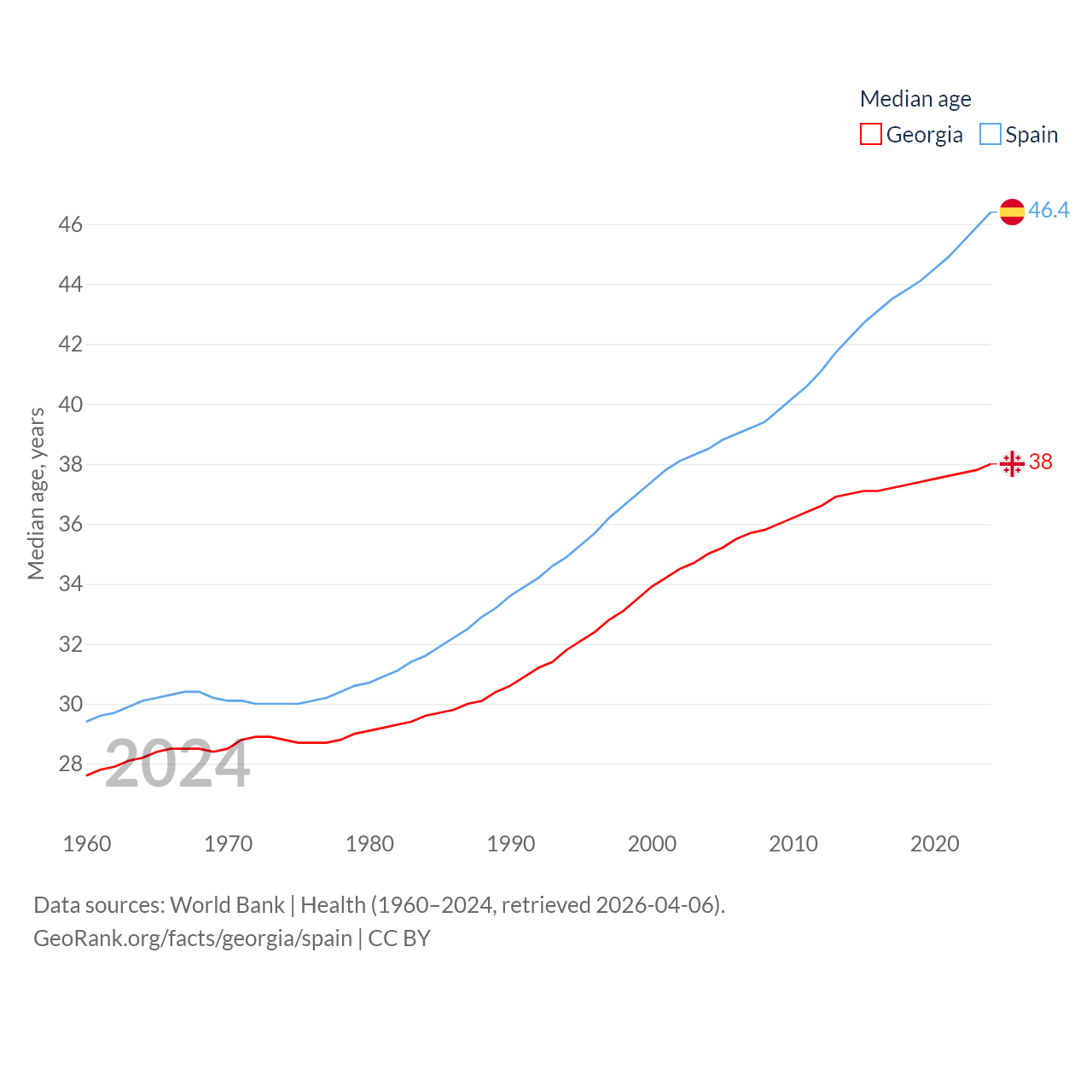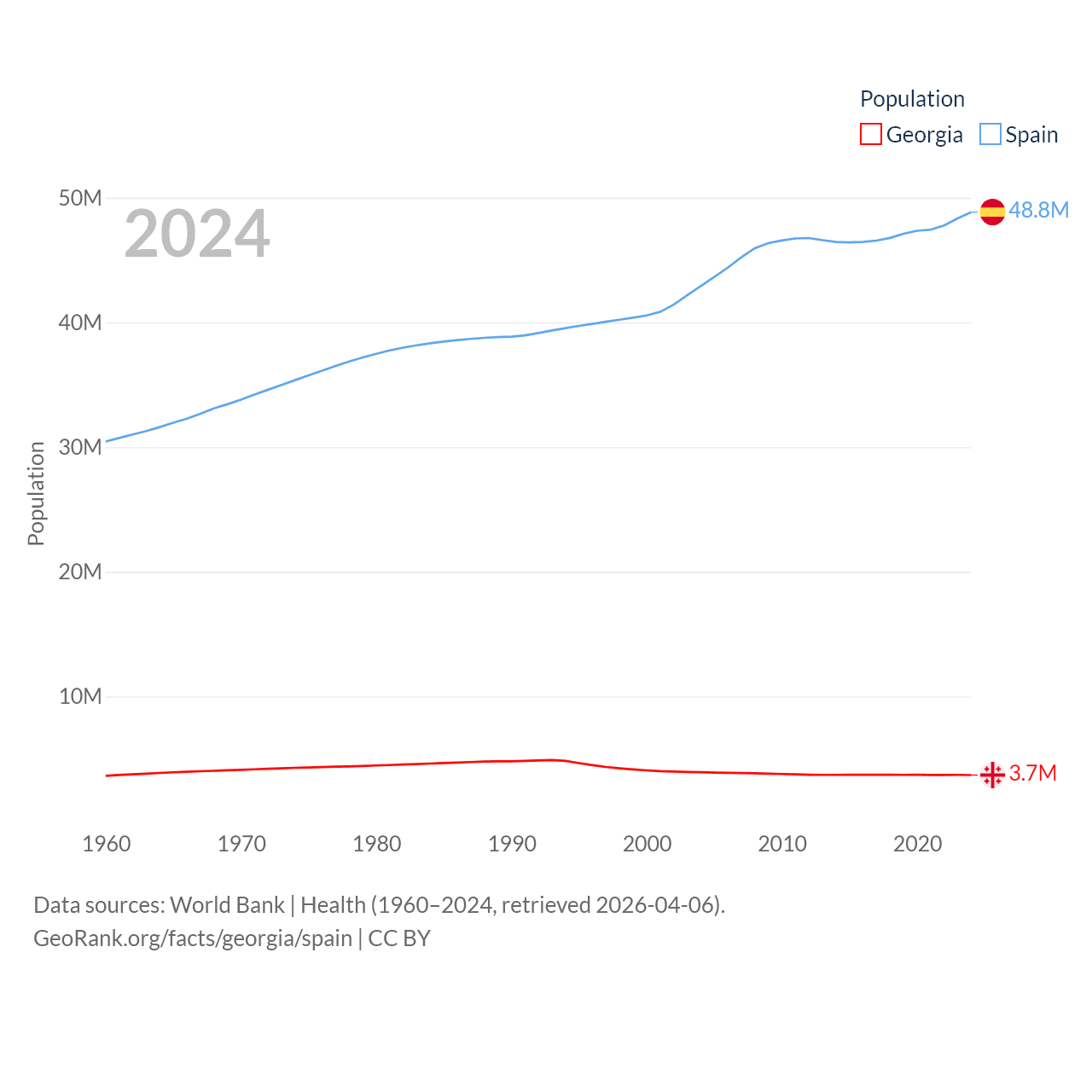 Georgia has a population of 3.7M (ranked 130/197), compared with 48.8M in Spain (ranked 32/197). Georgia's land area is 26,830 sq mi versus 192,934 sq mi for Spain (ranked 118th vs. 51st).