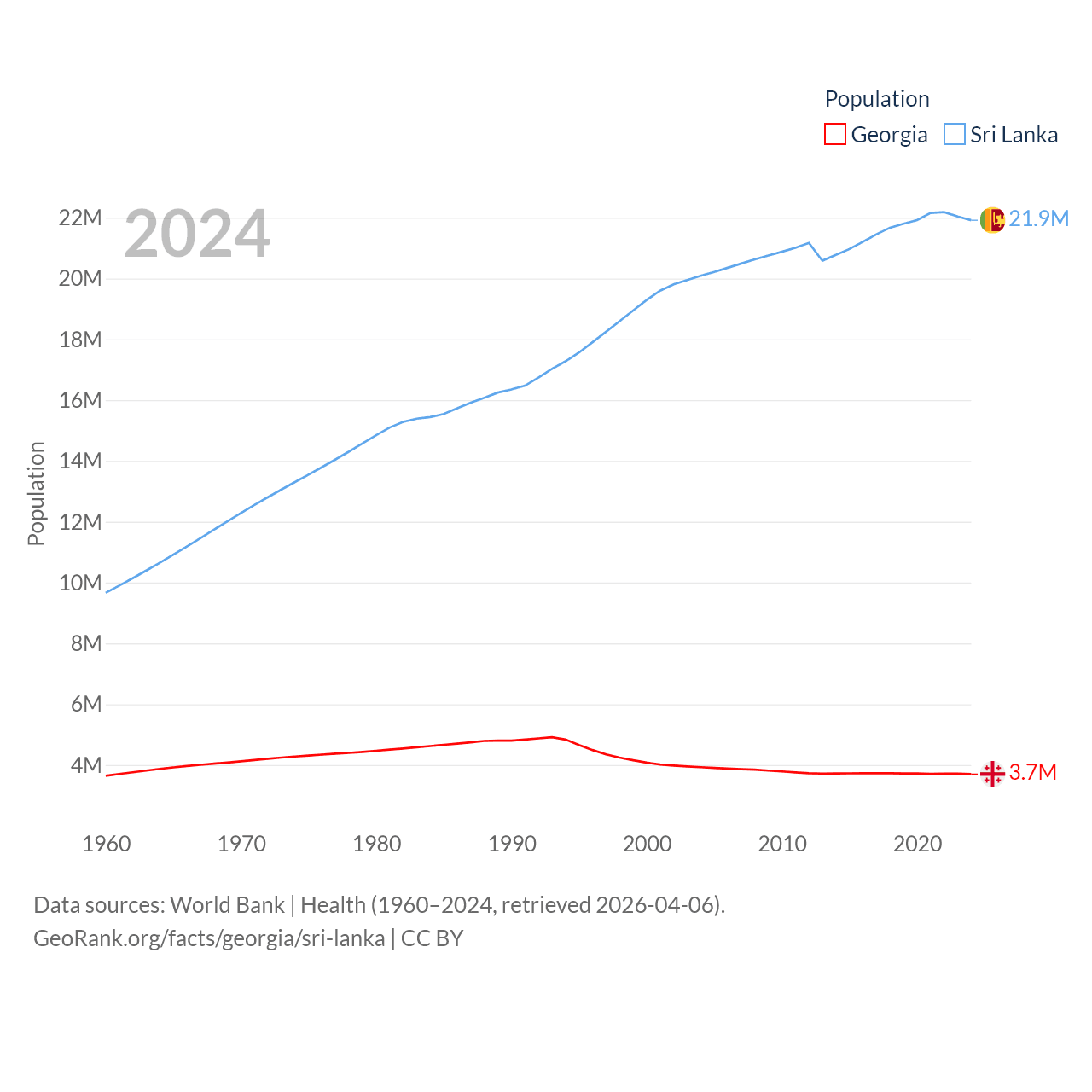 Georgia has a population of 3.7M (ranked 130/197), compared with 21.9M in Sri Lanka (ranked 61/197). Georgia's land area is 26,830 sq mi versus 23,884 sq mi for Sri Lanka (ranked 118th vs. 122nd).