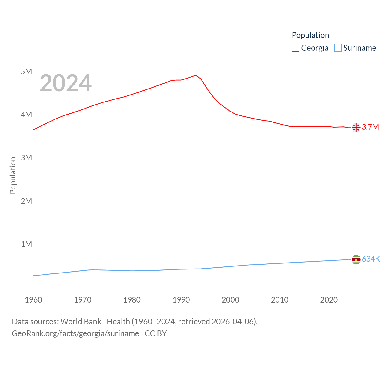 Georgia has a population of 3.7M (ranked 130/197), compared with 634K in Suriname (ranked 165/197). Georgia's land area is 26,830 sq mi versus 61,972 sq mi for Suriname (ranked 118th vs. 90th).