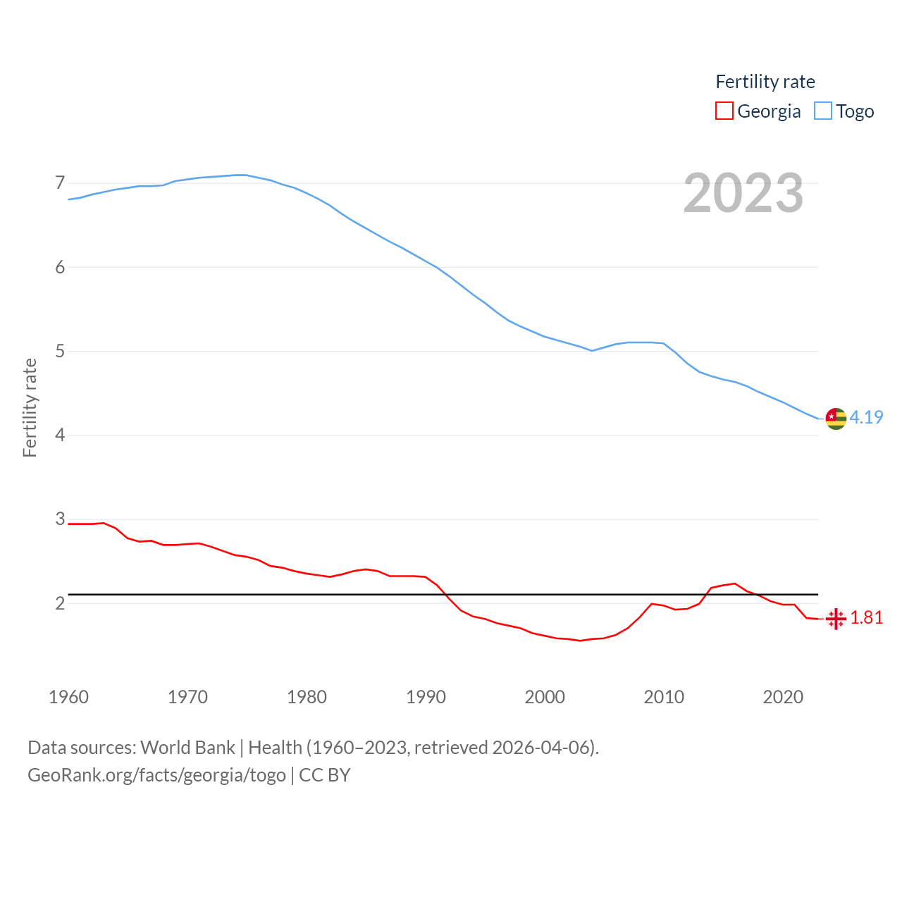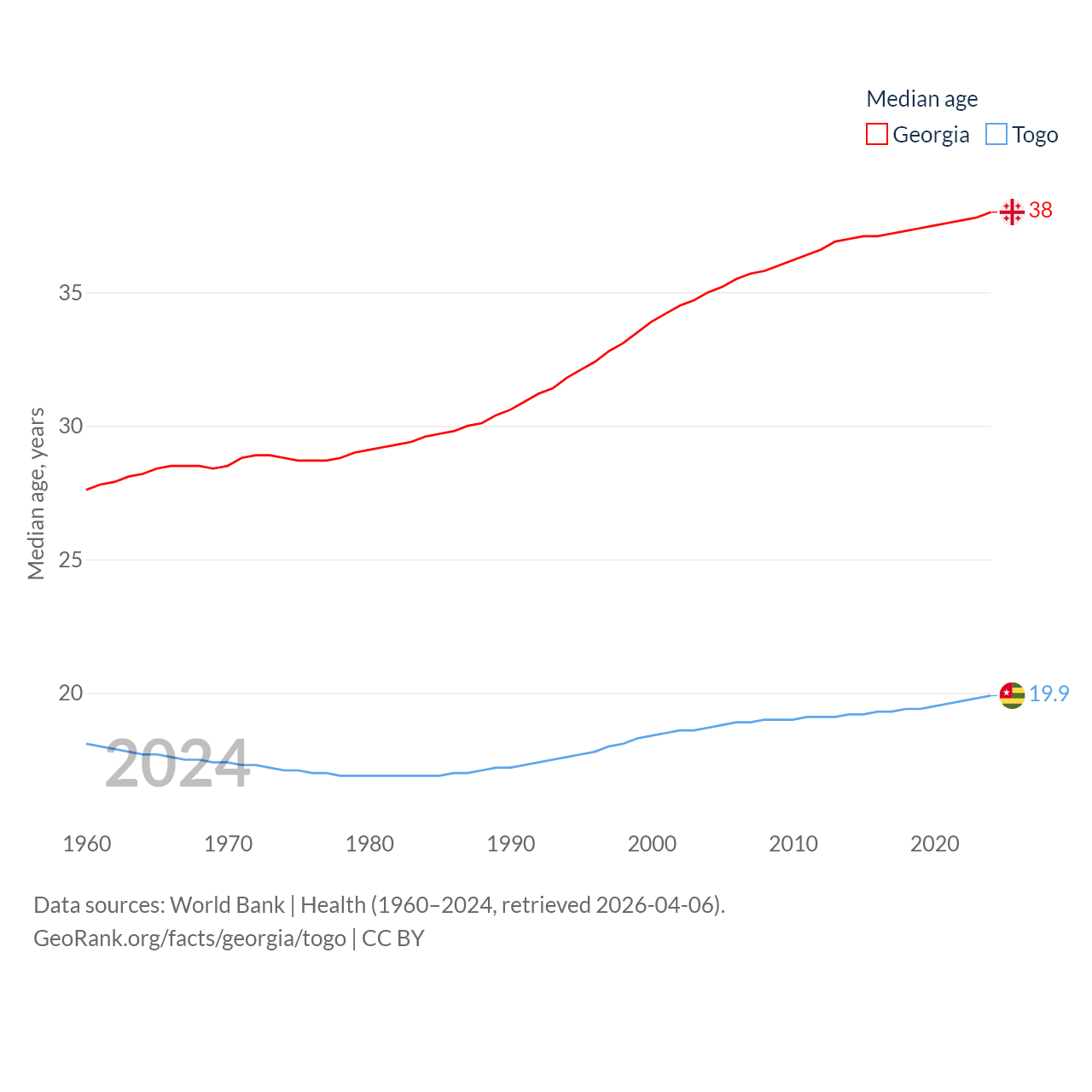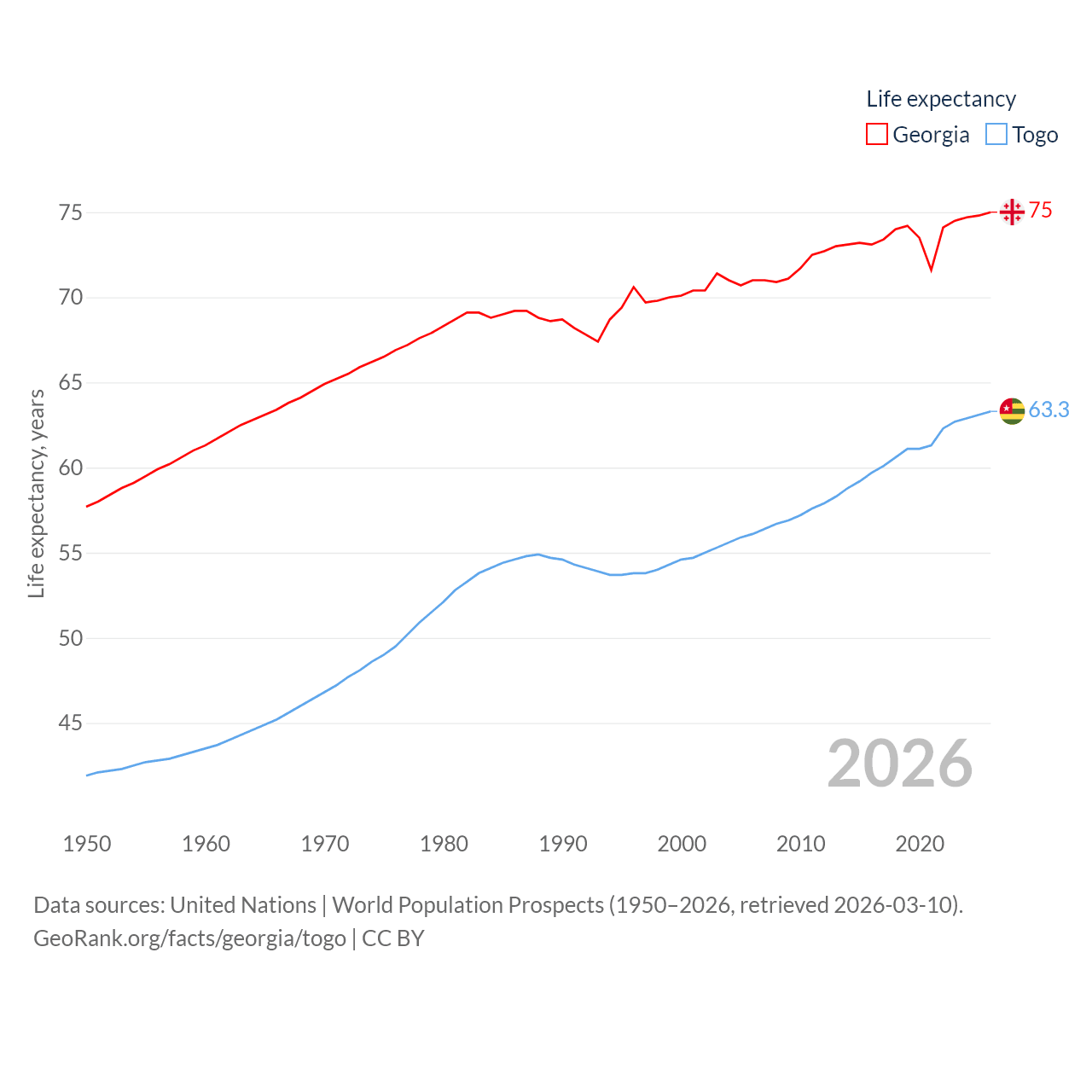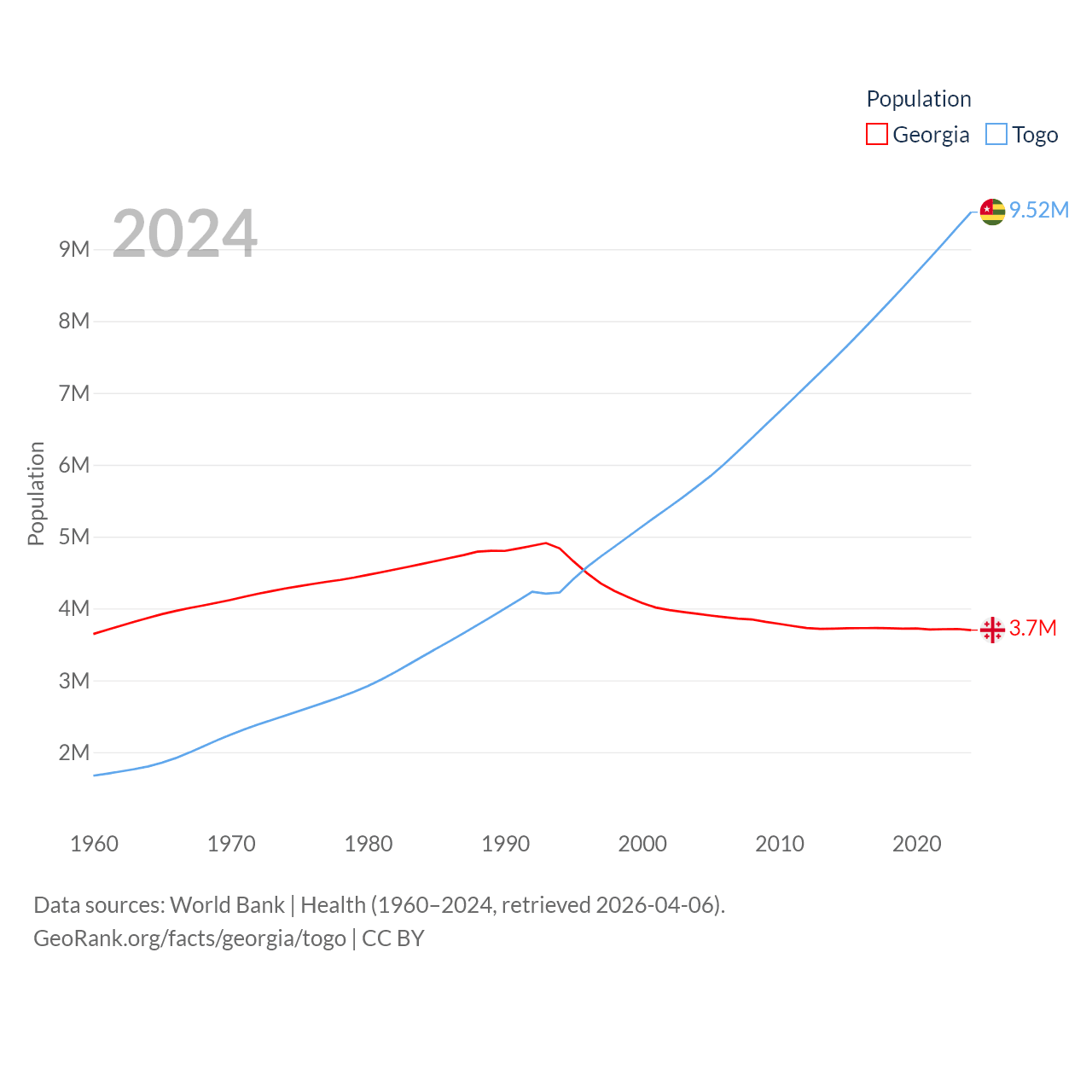 Georgia has a population of 3.7M (ranked 130/197), compared with 9.52M in Togo (ranked 98/197). Georgia's land area is 26,830 sq mi versus 21,000 sq mi for Togo (ranked 118th vs. 124th).