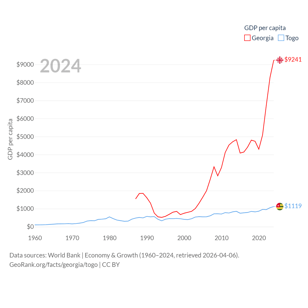 By GDP, Georgia ranks 107/197 ($34.2B) and Togo ranks 154/197 ($10.7B). By GDP per capita, Georgia ranks 89/197 ($9,241), while Togo ranks 172/197 ($1,119).
