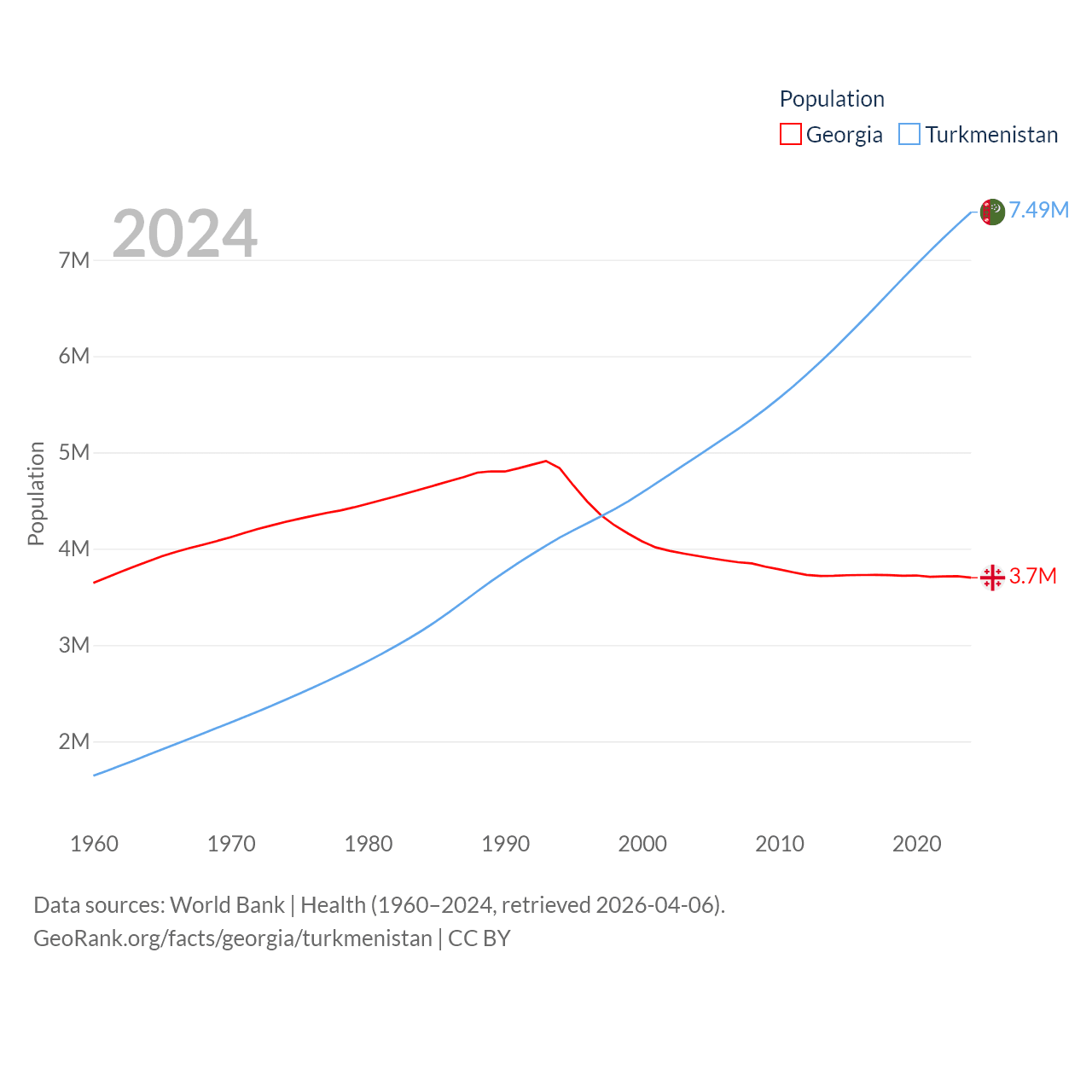 Georgia has a population of 3.7M (ranked 130/197), compared with 7.49M in Turkmenistan (ranked 104/197). Georgia's land area is 26,830 sq mi versus 181,441 sq mi for Turkmenistan (ranked 118th vs. 53rd).