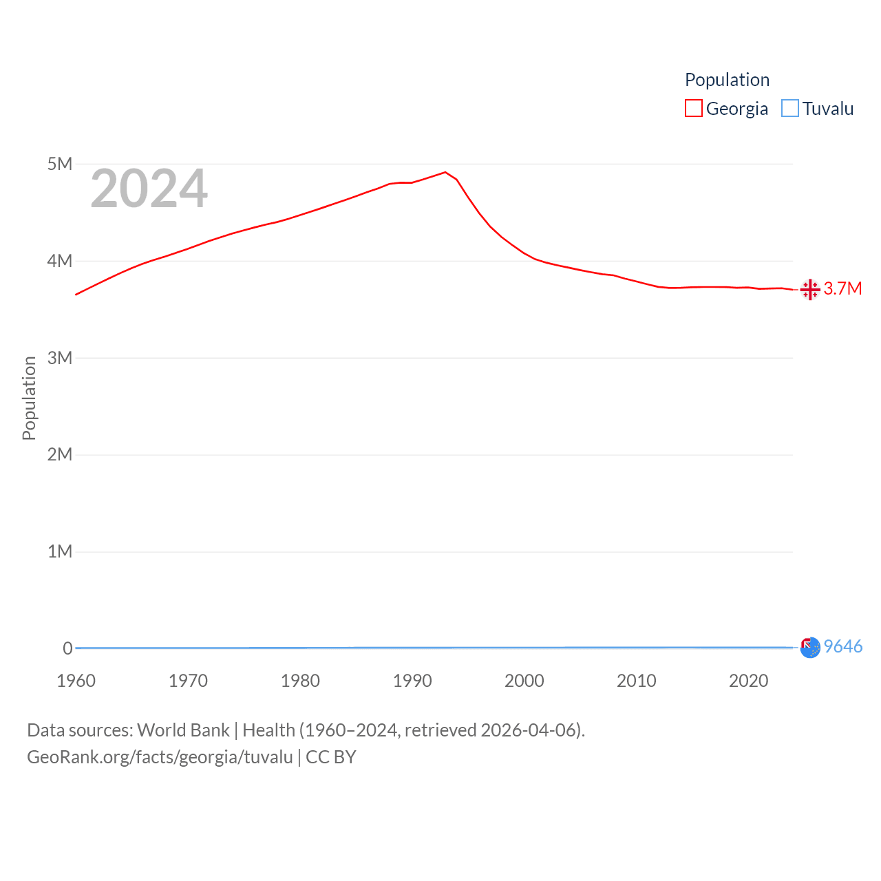 Georgia has a population of 3.7M (ranked 130/197), compared with 9.65K in Tuvalu (ranked 196/197). Georgia's land area is 26,830 sq mi versus 11.6 sq mi for Tuvalu (ranked 118th vs. 194th).