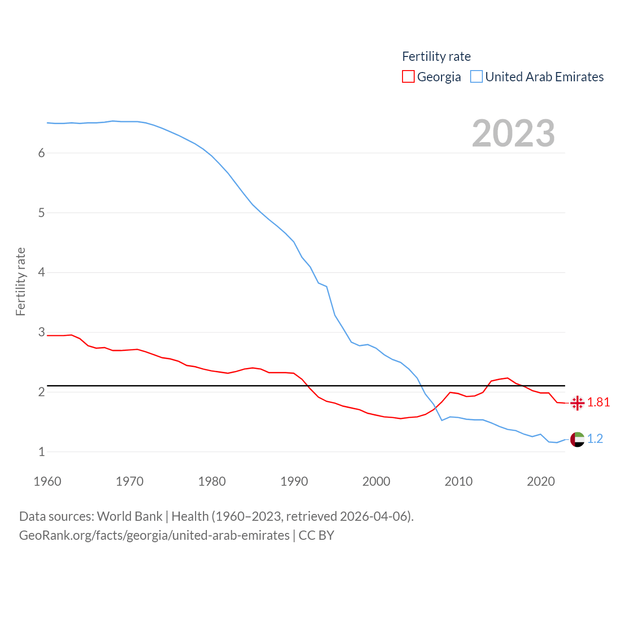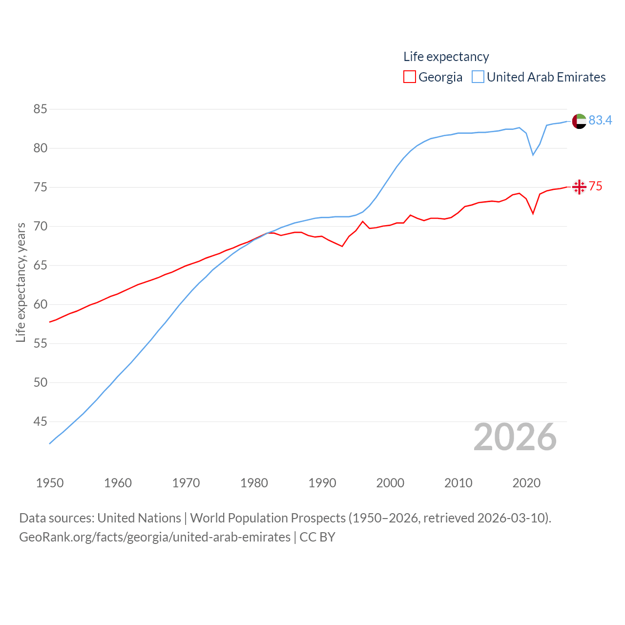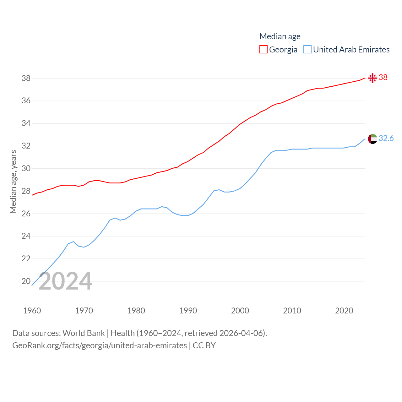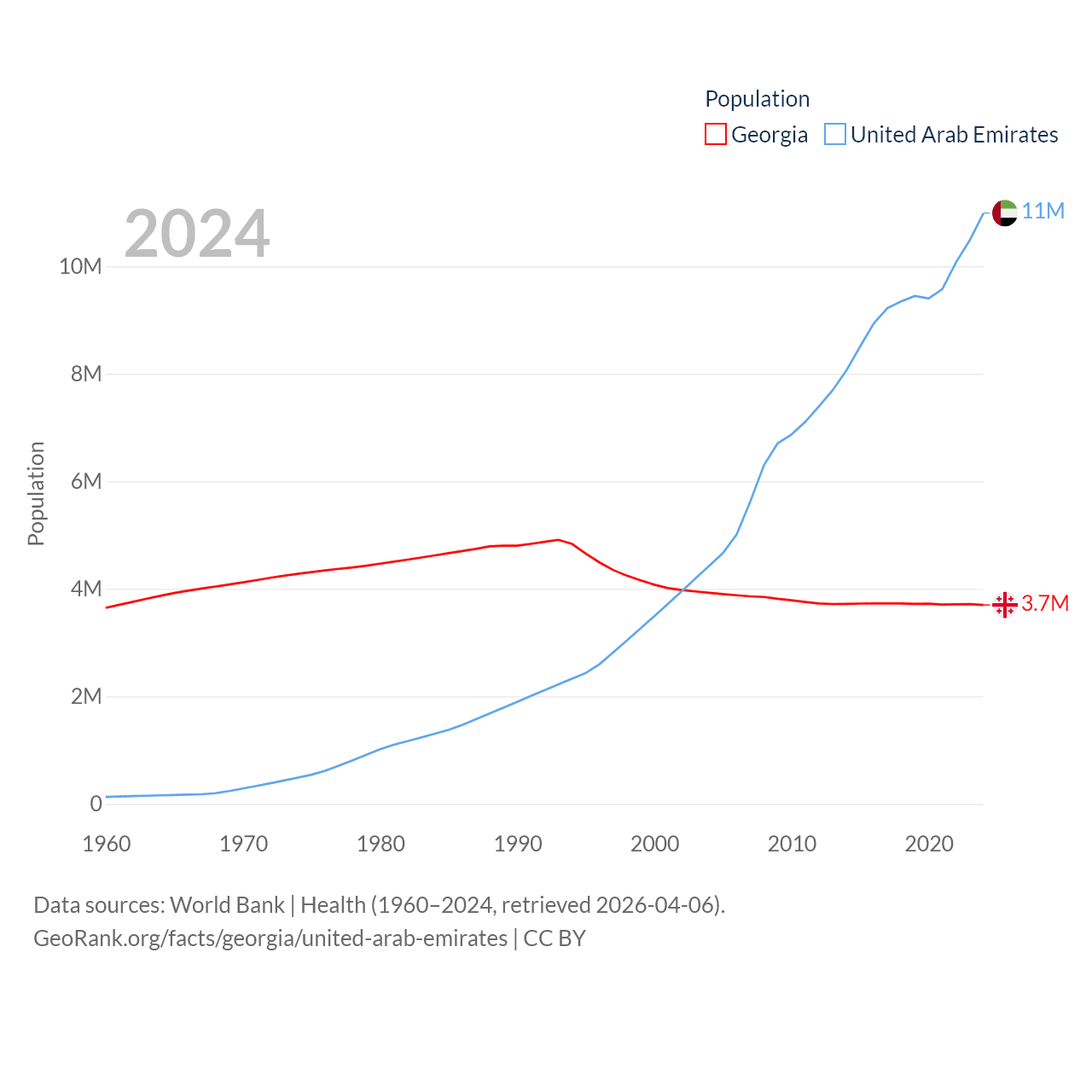 Georgia has a population of 3.7M (ranked 130/197), compared with 11M in The United Arab Emirates (ranked 86/197). Georgia's land area is 26,830 sq mi versus 27,421 sq mi for The United Arab Emirates (ranked 118th vs. 117th).