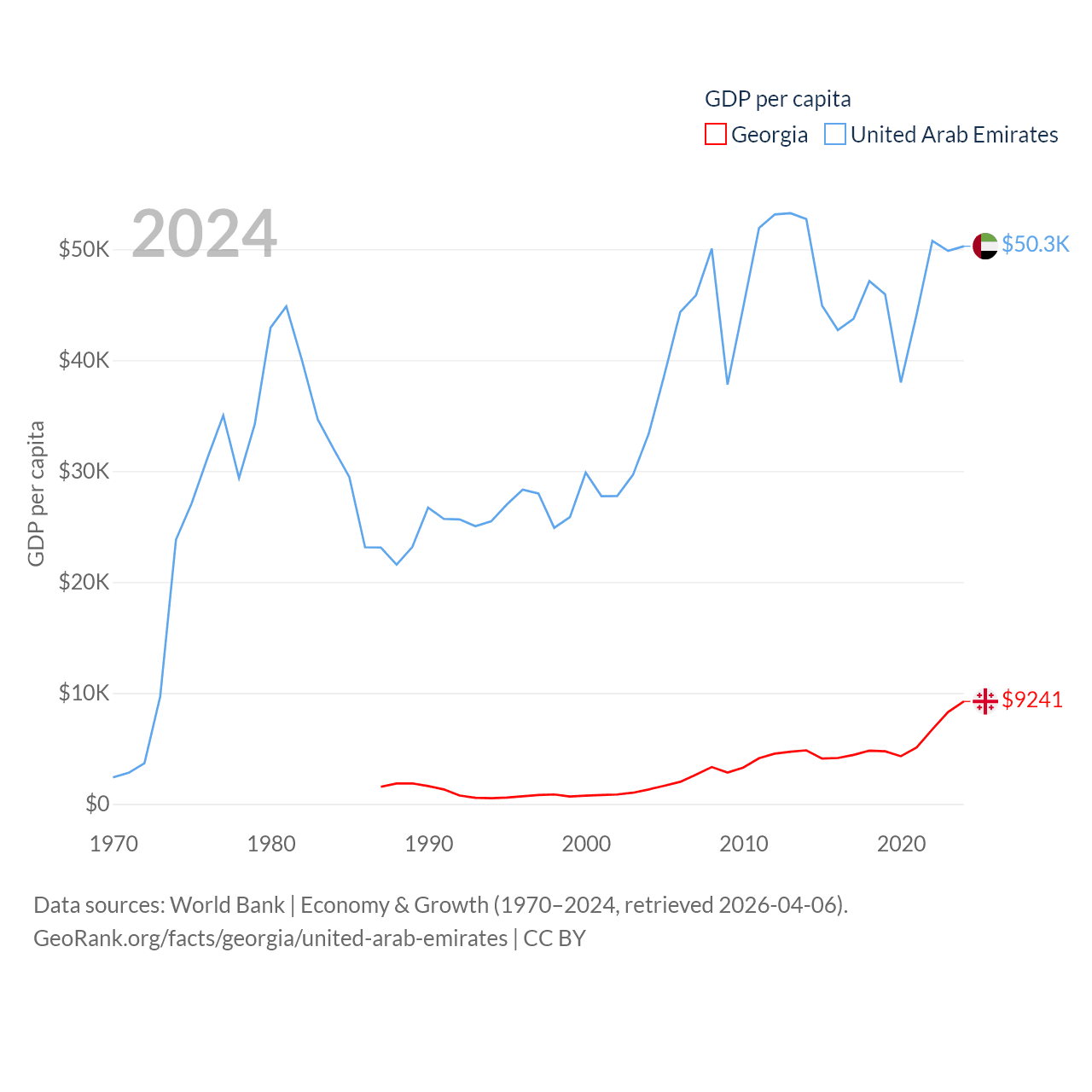 By GDP, Georgia ranks 107/197 ($34.2B) and The United Arab Emirates ranks 27/197 ($552B). By GDP per capita, Georgia ranks 89/197 ($9,241), while The United Arab Emirates ranks 24/197 ($50,274).