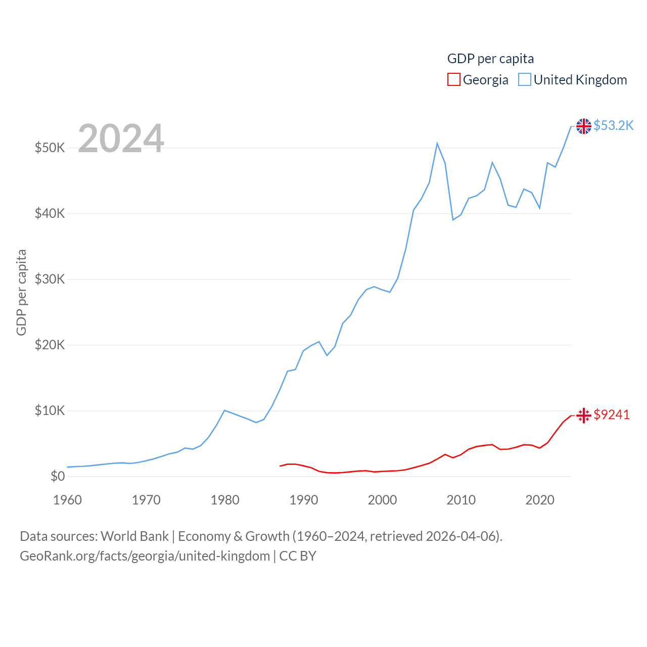 By GDP, Georgia ranks 107/197 ($34.2B) and The United Kingdom ranks 6/197 ($3.69T). By GDP per capita, Georgia ranks 89/197 ($9,241), while The United Kingdom ranks 22/197 ($53,246).