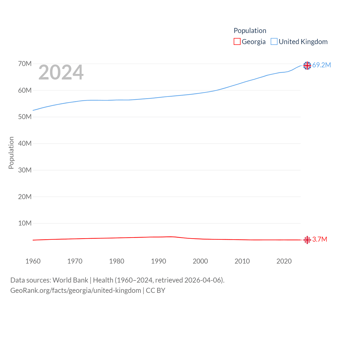 Georgia has a population of 3.7M (ranked 130/197), compared with 69.2M in The United Kingdom (ranked 21/197). Georgia's land area is 26,830 sq mi versus 93,410 sq mi for The United Kingdom (ranked 118th vs. 78th).