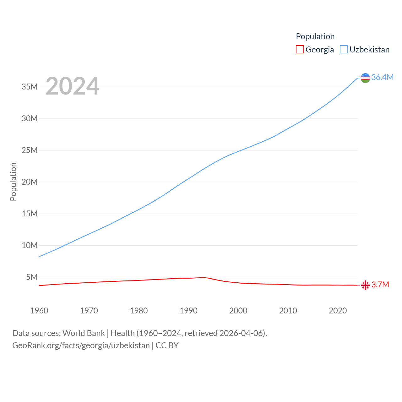 Georgia has a population of 3.7M (ranked 130/197), compared with 36.4M in Uzbekistan (ranked 43/197). Georgia's land area is 26,830 sq mi versus 170,136 sq mi for Uzbekistan (ranked 118th vs. 56th).