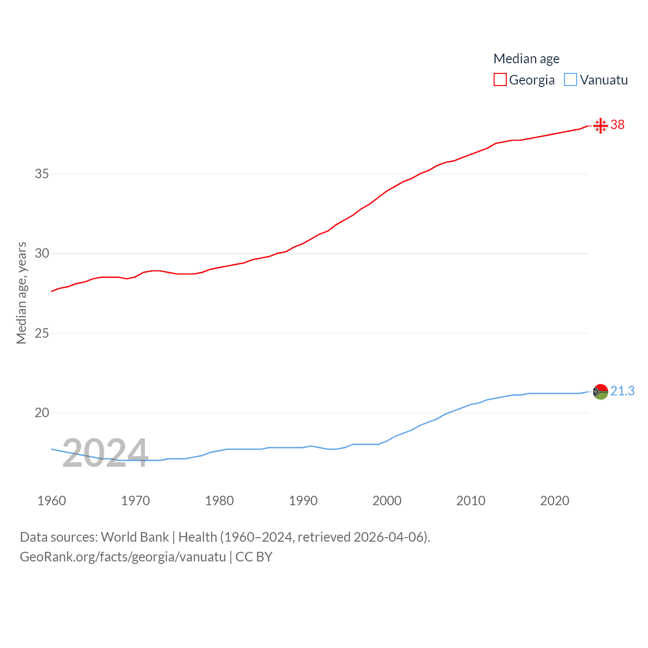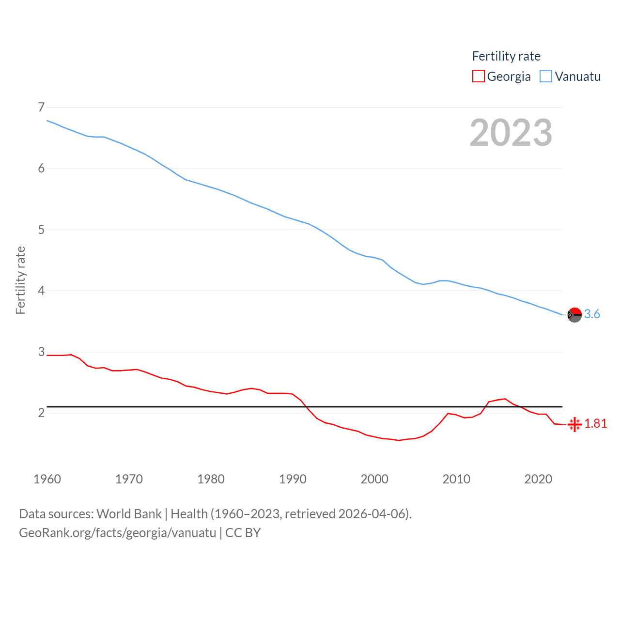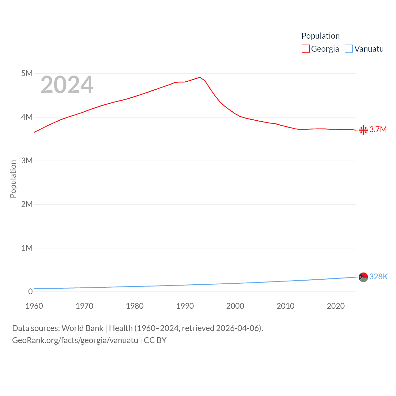 Georgia has a population of 3.7M (ranked 130/197), compared with 328K in Vanuatu (ranked 174/197). Georgia's land area is 26,830 sq mi versus 4,707 sq mi for Vanuatu (ranked 118th vs. 157th).