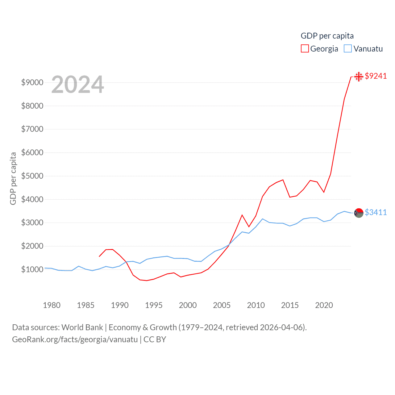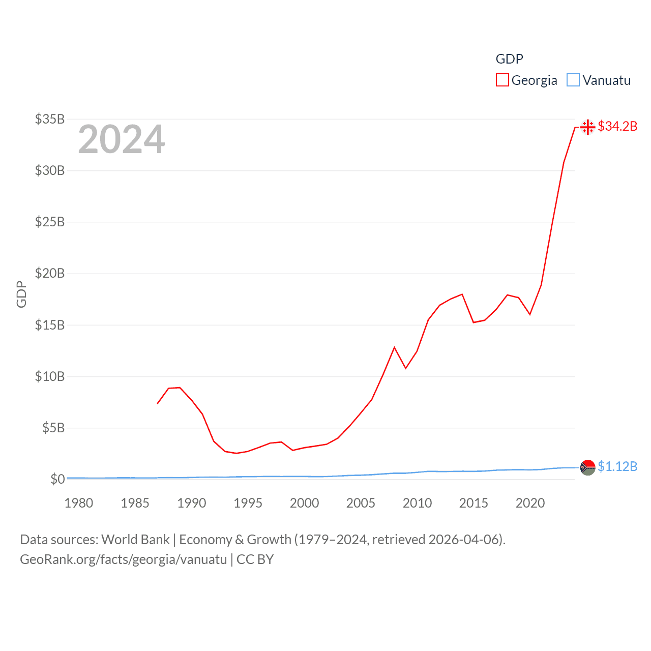 By GDP, Georgia ranks 107/197 ($34.2B) and Vanuatu ranks 188/197 ($1.12B). By GDP per capita, Georgia ranks 89/197 ($9,241), while Vanuatu ranks 137/197 ($3,411).