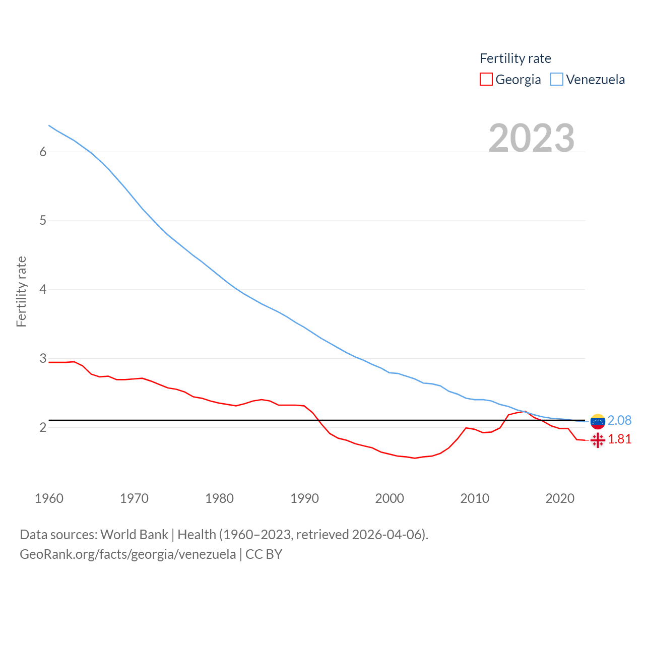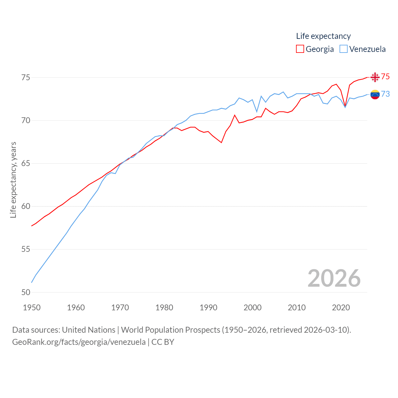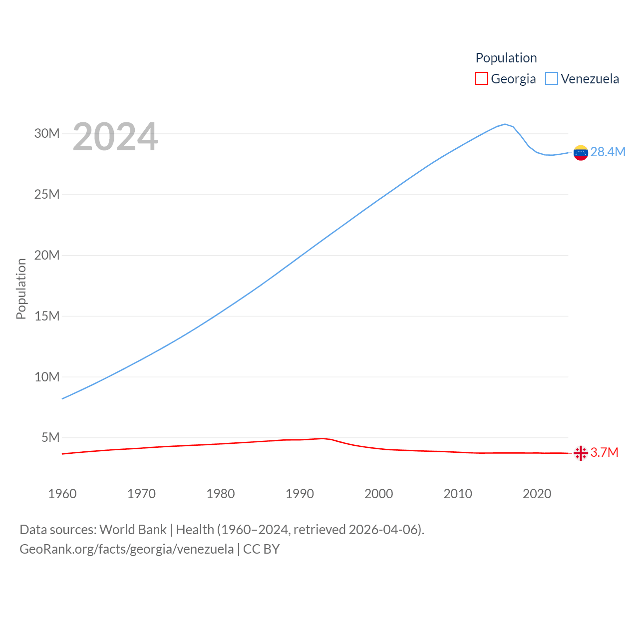 Georgia has a population of 3.7M (ranked 130/197), compared with 28.4M in Venezuela (ranked 53/197). Georgia's land area is 26,830 sq mi versus 340,561 sq mi for Venezuela (ranked 118th vs. 32nd).