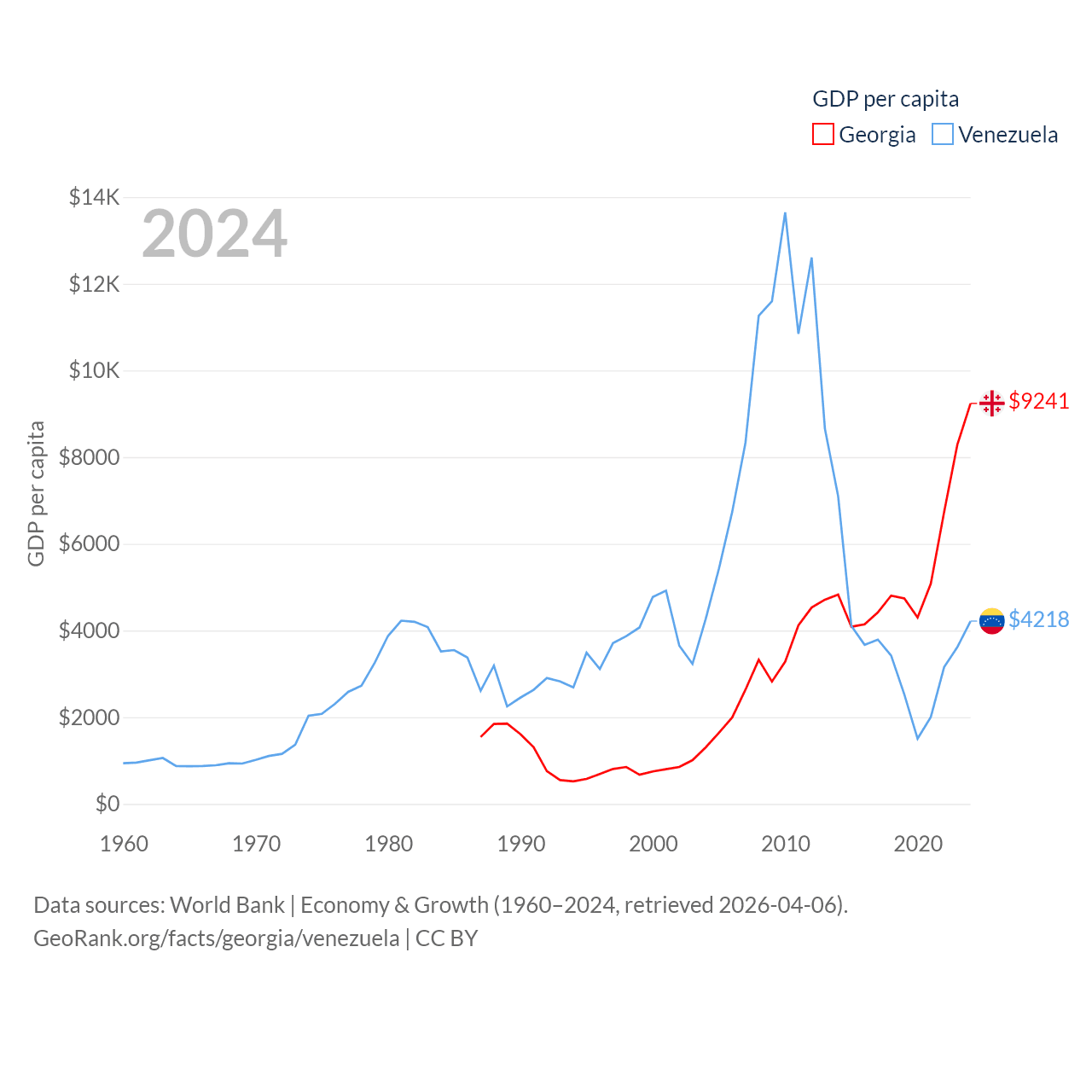 By GDP, Georgia ranks 107/197 ($34.2B) and Venezuela ranks 65/197 ($120B). By GDP per capita, Georgia ranks 89/197 ($9,241), while Venezuela ranks 128/197 ($4,218).
