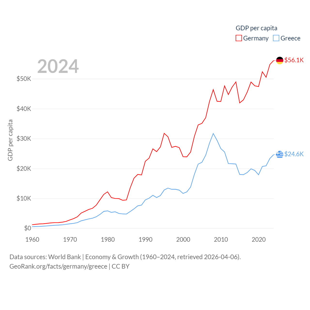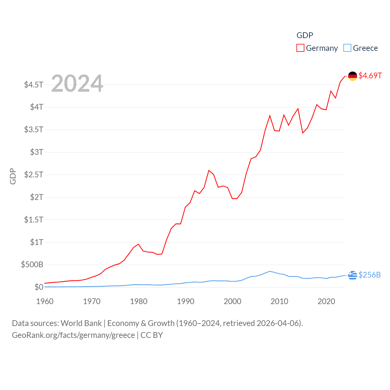 By GDP, Germany ranks 3/197 ($4.69T) and Greece ranks 53/197 ($256B). By GDP per capita, Germany ranks 19/197 ($56,104), while Greece ranks 49/197 ($24,626).