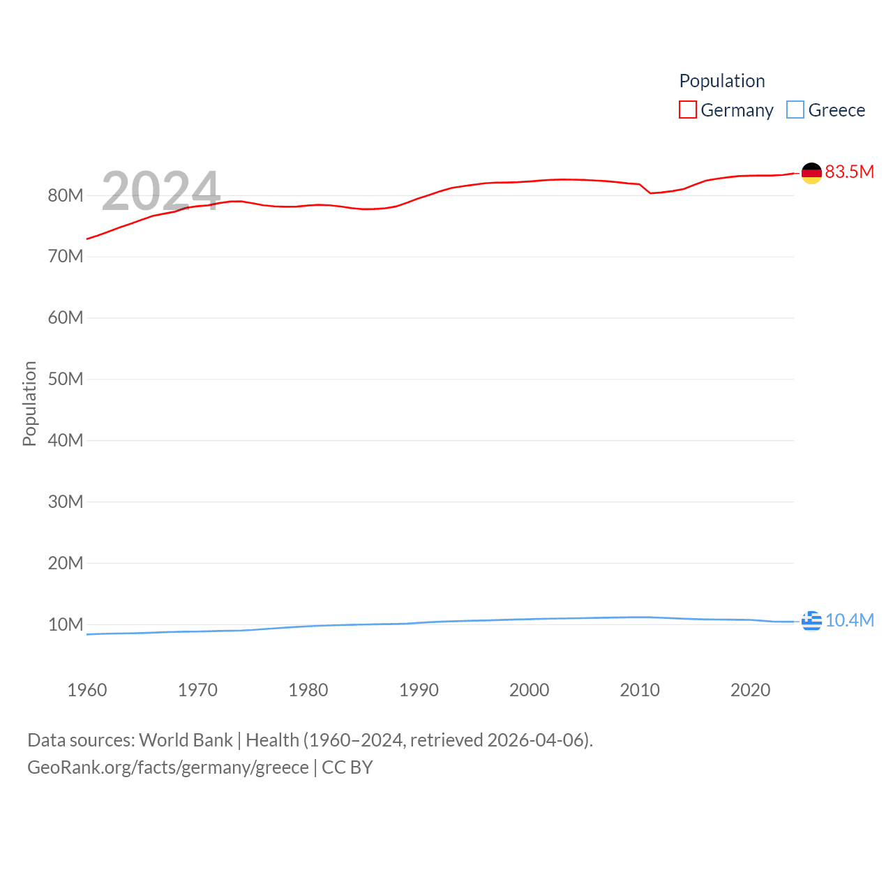 Germany has a population of 83.5M (ranked 19/197), compared with 10.4M in Greece (ranked 94/197). Germany's land area is 134,916 sq mi versus 49,769 sq mi for Greece (ranked 63rd vs. 95th).