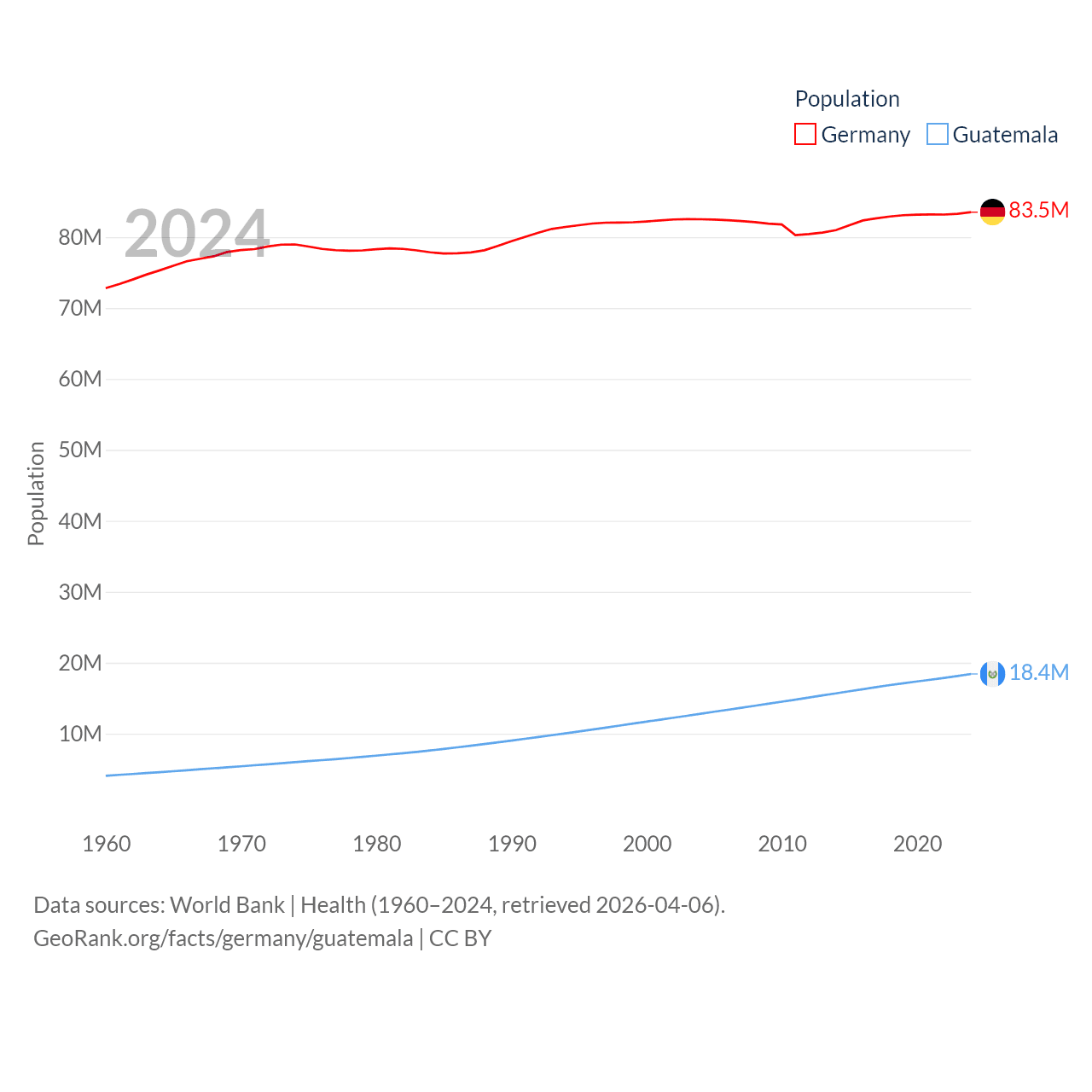 Germany has a population of 83.5M (ranked 19/197), compared with 18.4M in Guatemala (ranked 70/197). Germany's land area is 134,916 sq mi versus 41,375 sq mi for Guatemala (ranked 63rd vs. 102nd).