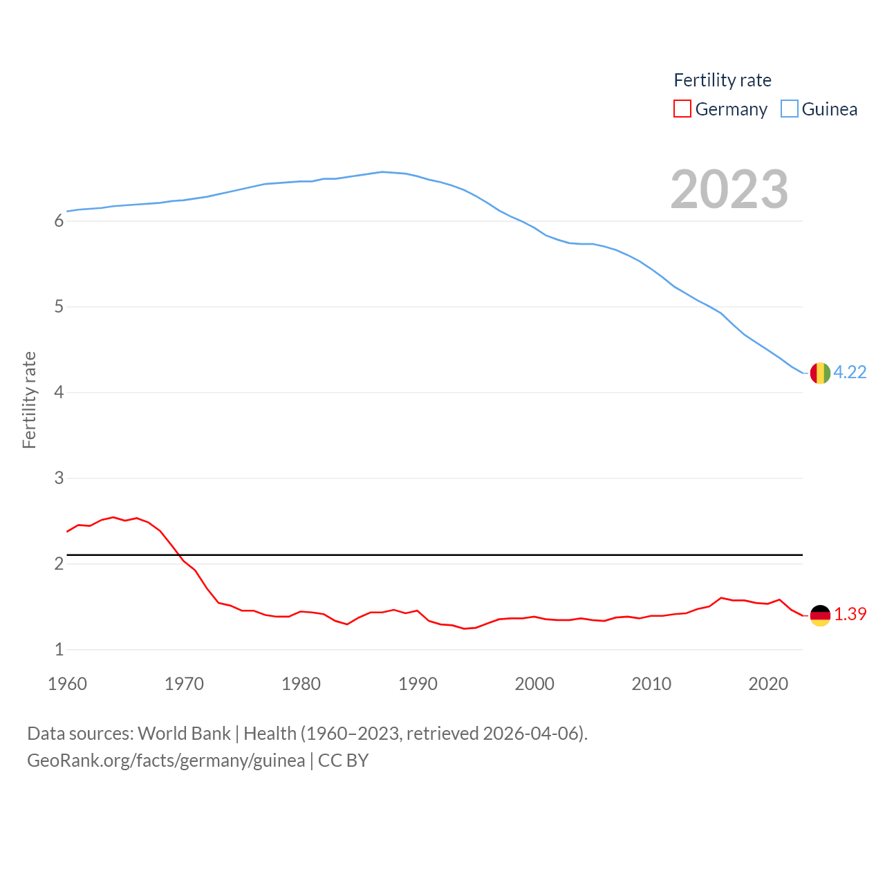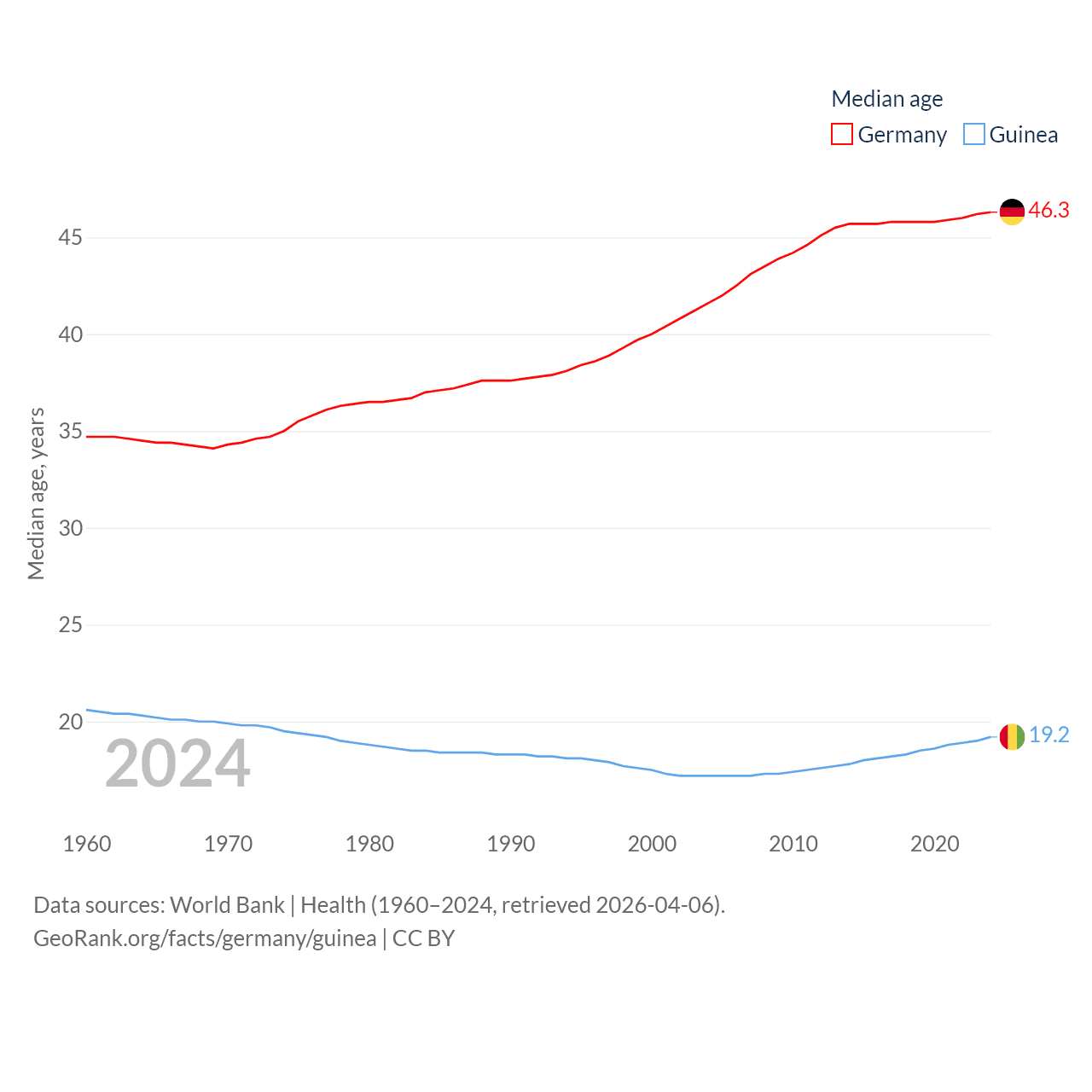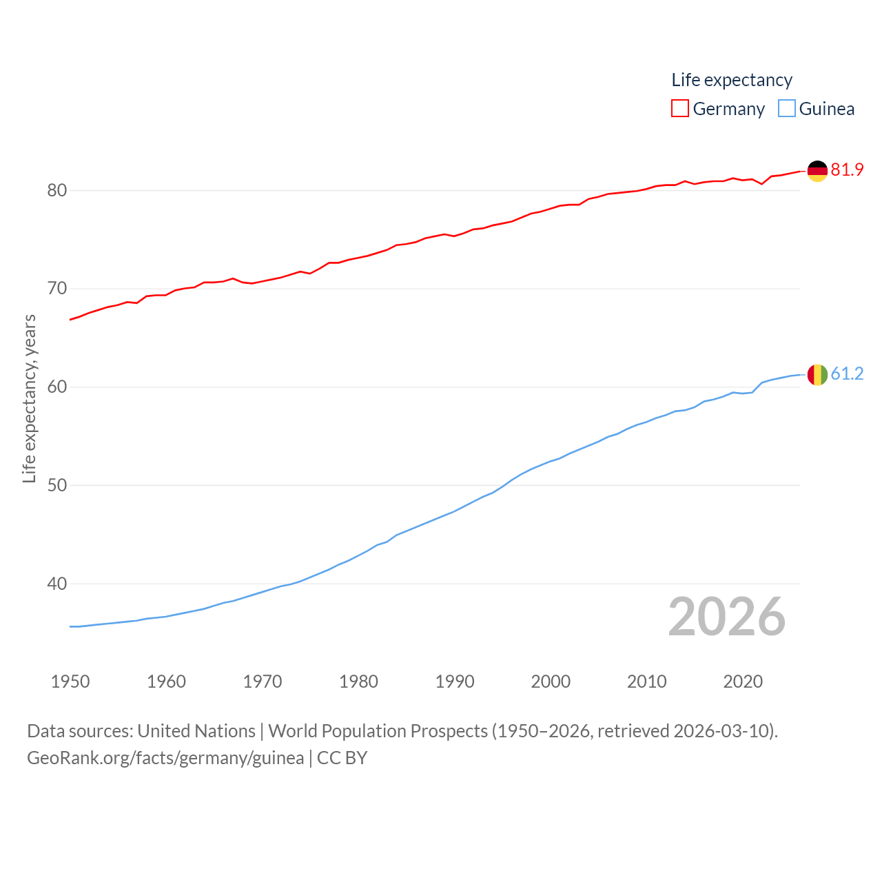 Germany has a population of 83.5M (ranked 19/197), compared with 14.8M in Guinea (ranked 75/197). Germany's land area is 134,916 sq mi versus 94,873 sq mi for Guinea (ranked 63rd vs. 77th).
