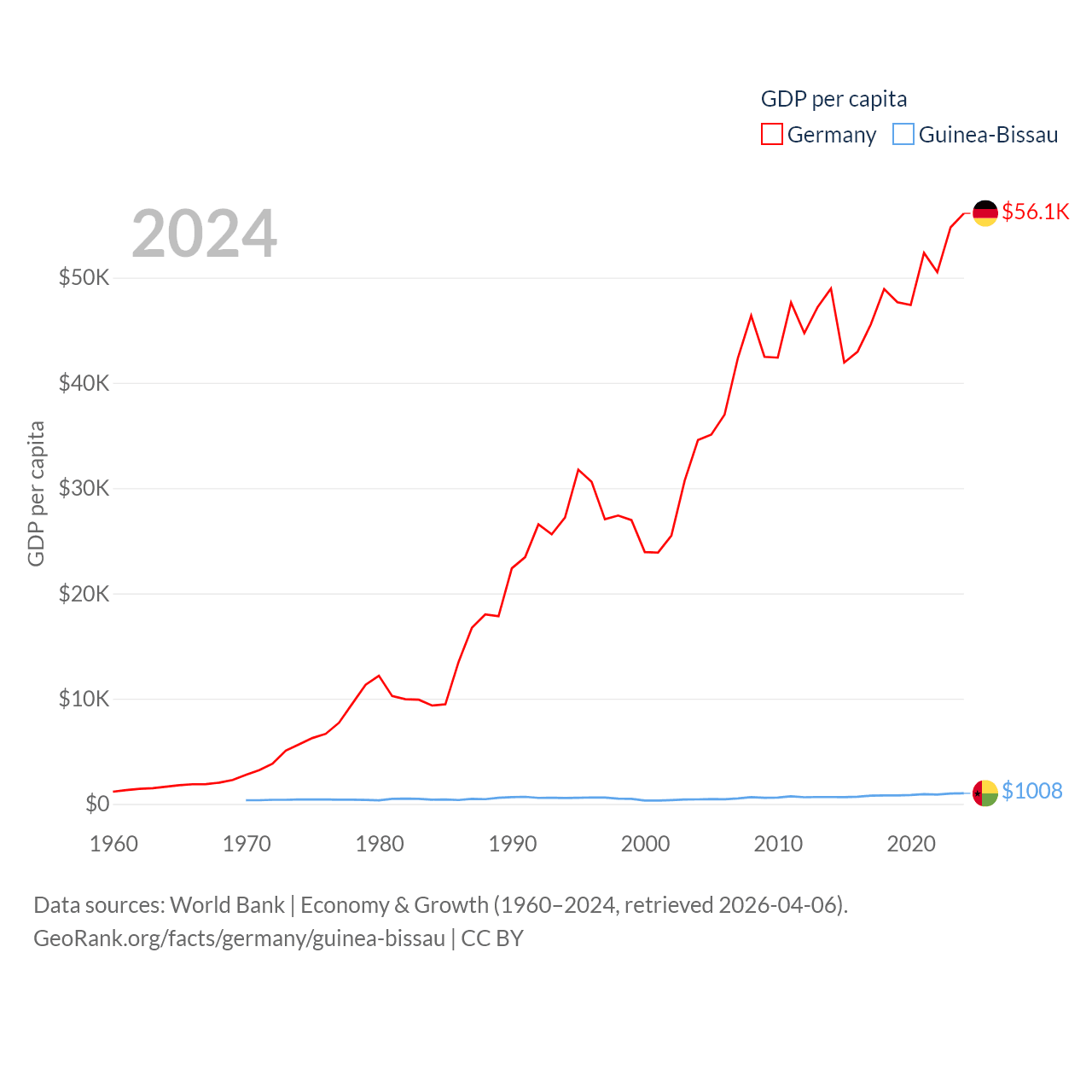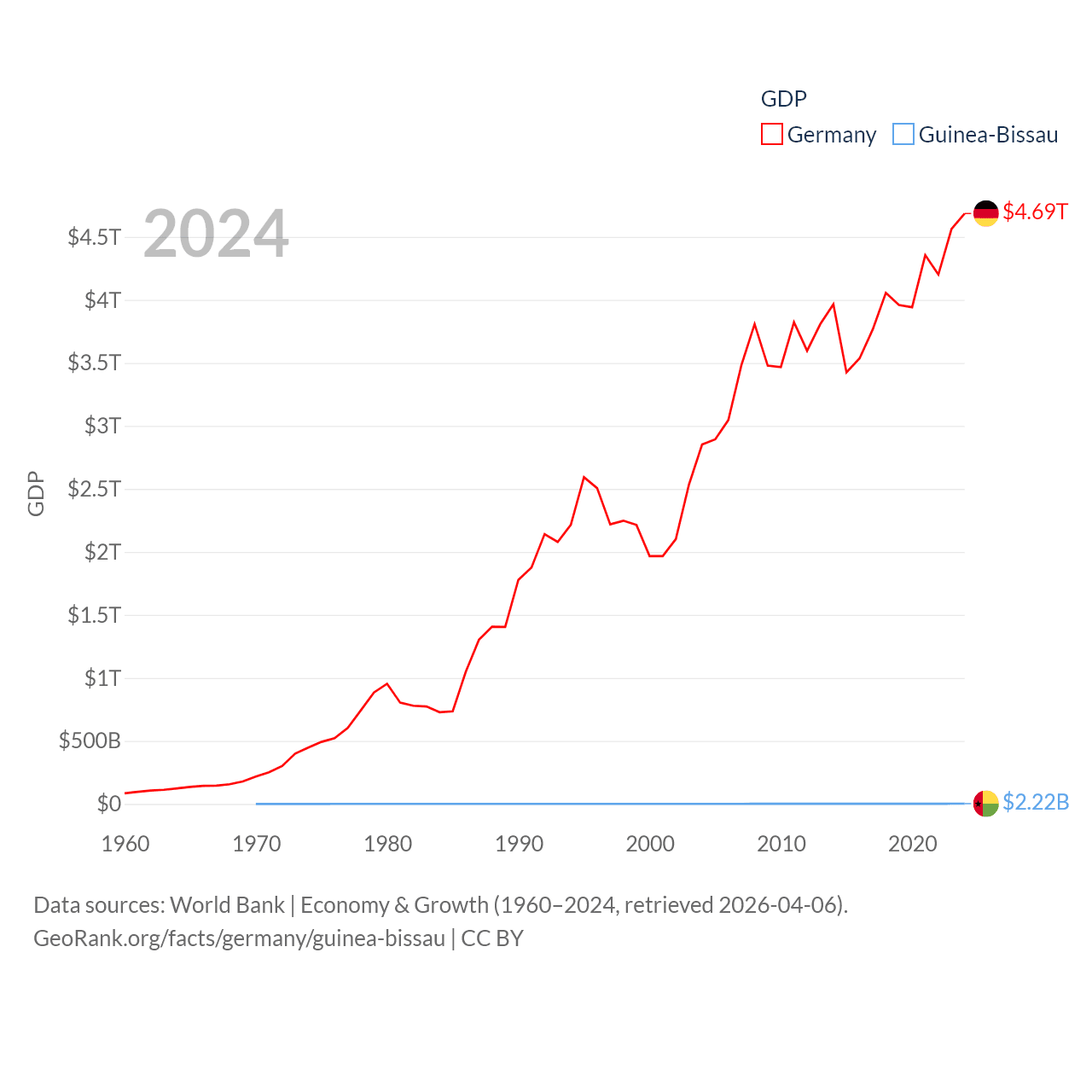 By GDP, Germany ranks 3/197 ($4.69T) and Guinea-Bissau ranks 176/197 ($2.22B). By GDP per capita, Germany ranks 19/197 ($56,104), while Guinea-Bissau ranks 177/197 ($1,008).