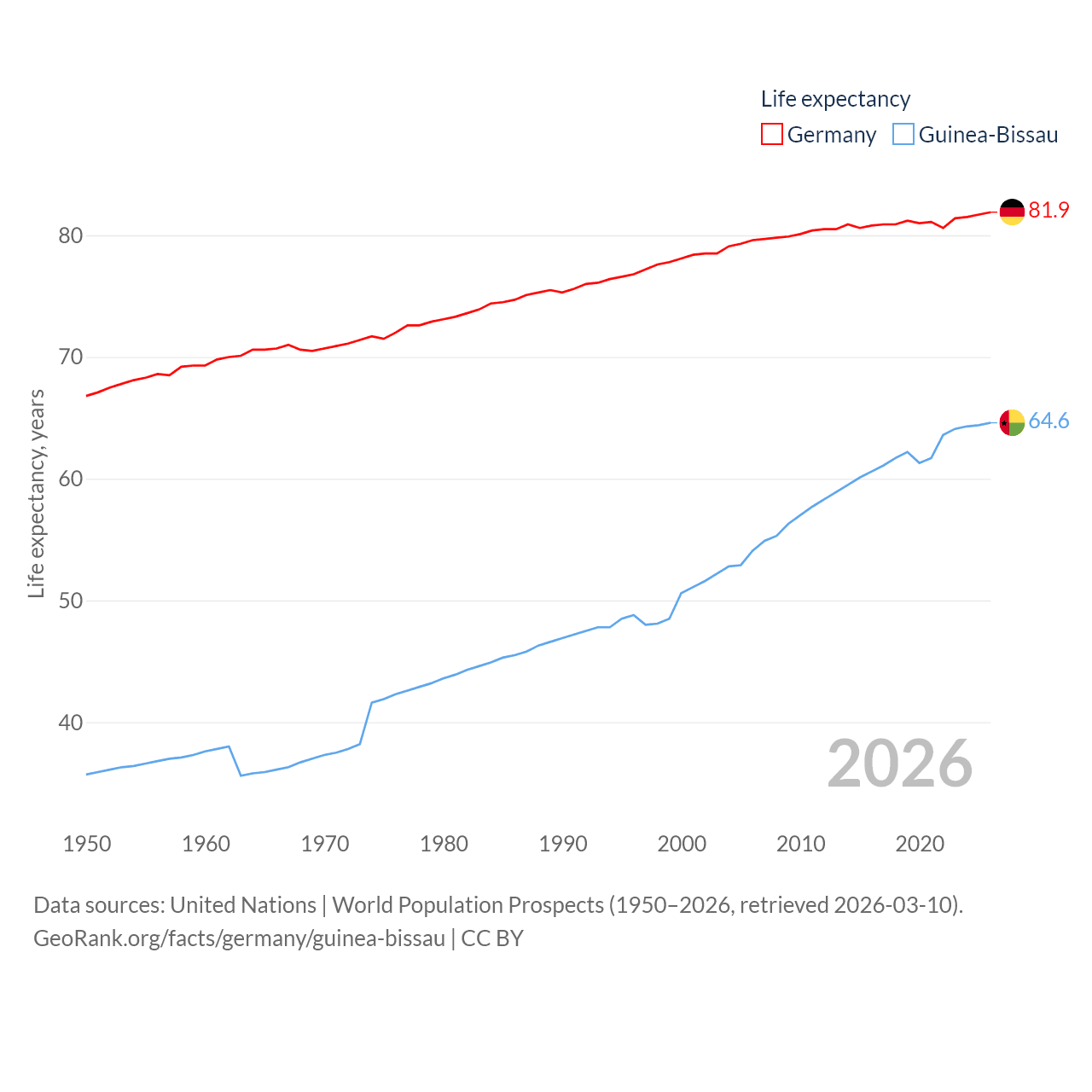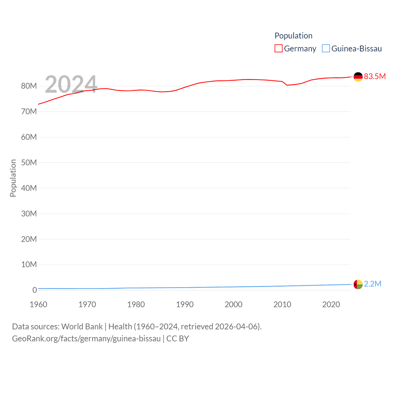 Germany has a population of 83.5M (ranked 19/197), compared with 2.2M in Guinea-Bissau (ranked 146/197). Germany's land area is 134,916 sq mi versus 10,857 sq mi for Guinea-Bissau (ranked 63rd vs. 139th).