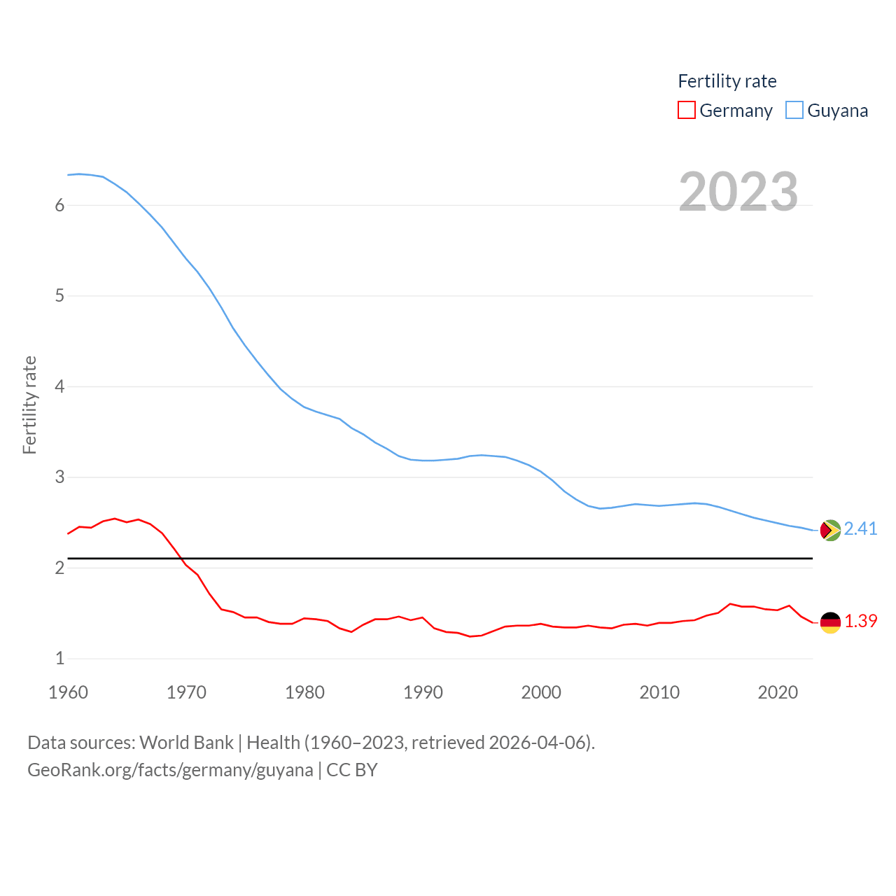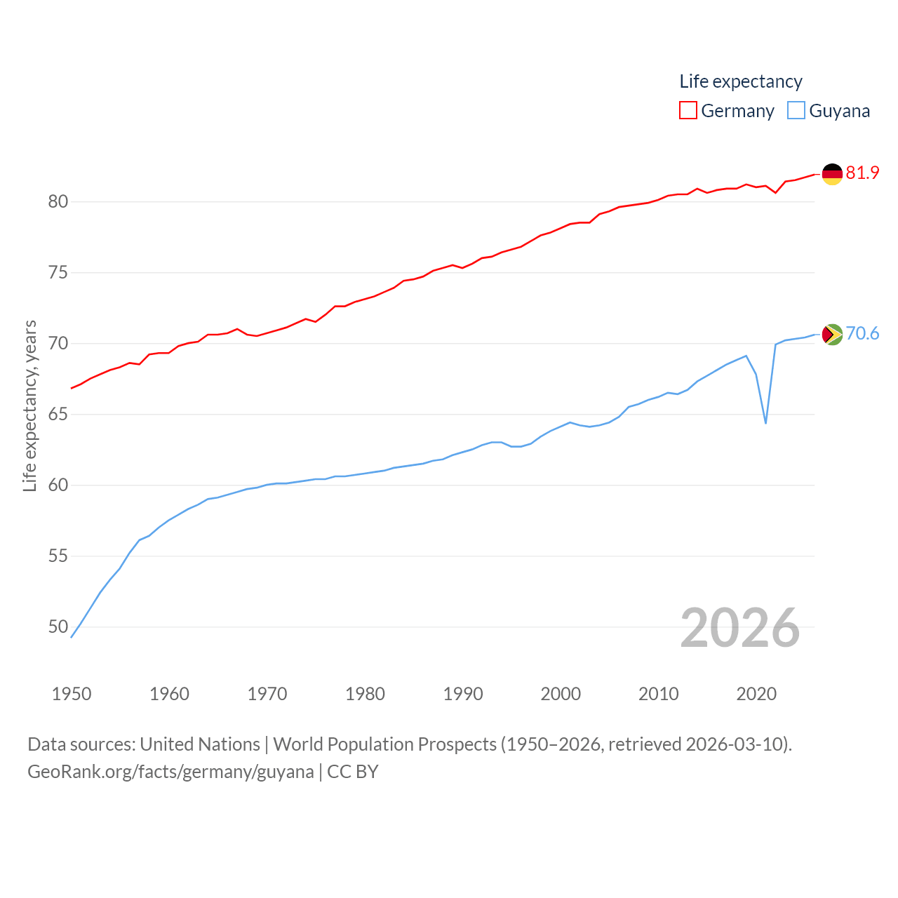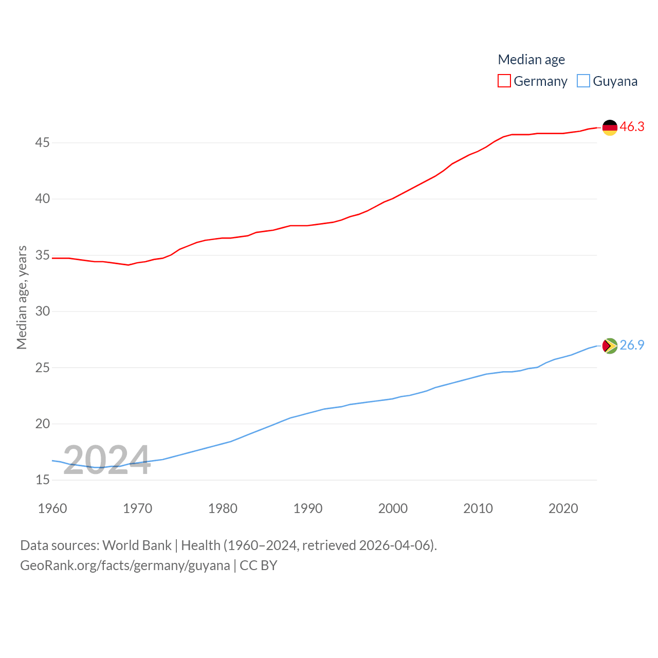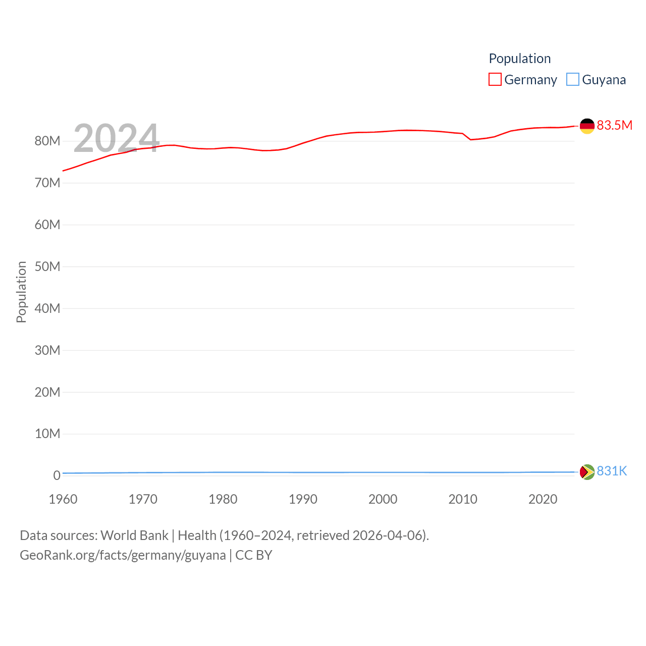 Germany has a population of 83.5M (ranked 19/197), compared with 831K in Guyana (ranked 161/197). Germany's land area is 134,916 sq mi versus 81,522 sq mi for Guyana (ranked 63rd vs. 82nd).