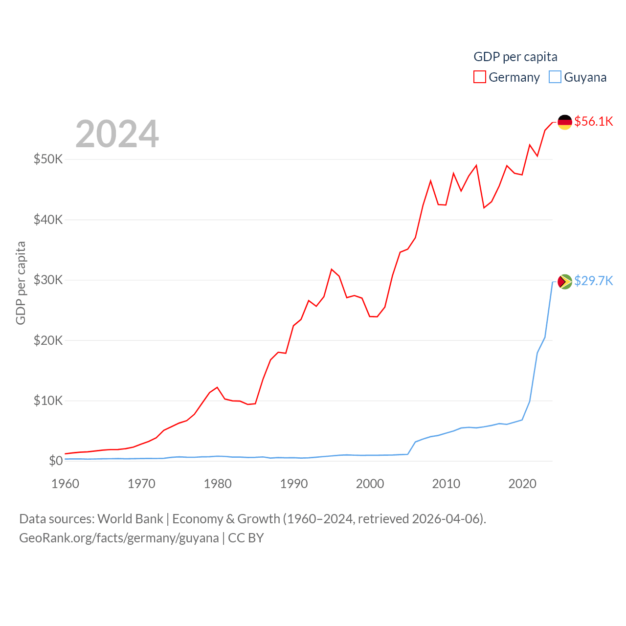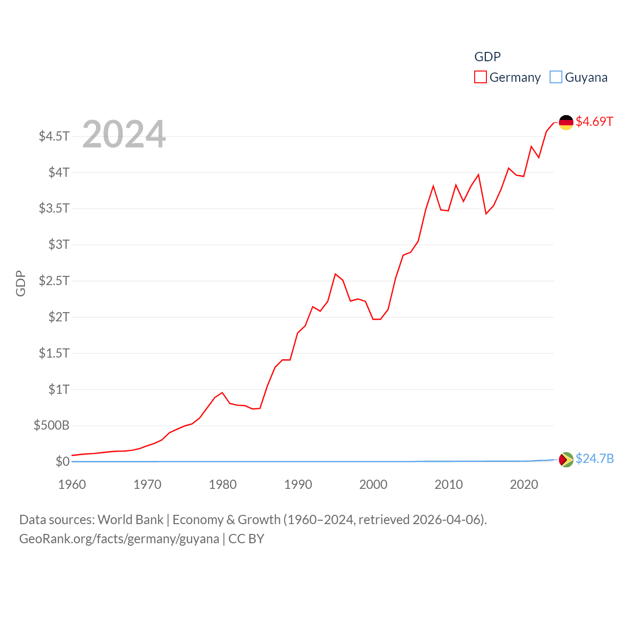 By GDP, Germany ranks 3/197 ($4.69T) and Guyana ranks 120/197 ($24.7B). By GDP per capita, Germany ranks 19/197 ($56,104), while Guyana ranks 41/197 ($29,675).