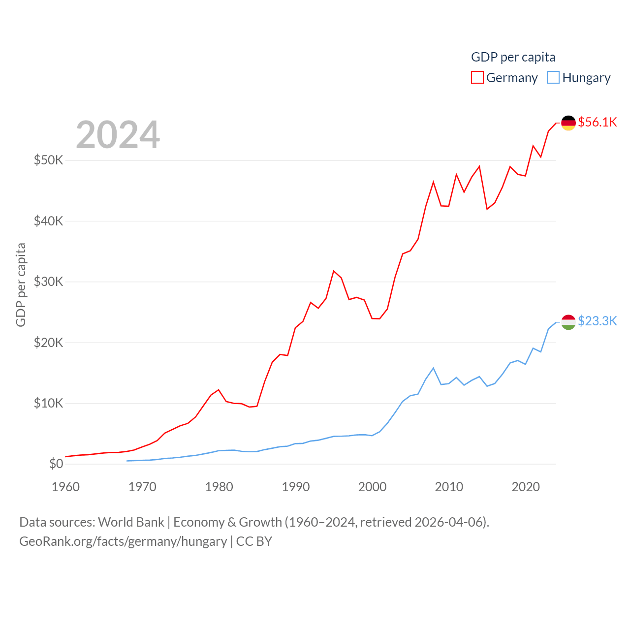 By GDP, Germany ranks 3/197 ($4.69T) and Hungary ranks 55/197 ($223B). By GDP per capita, Germany ranks 19/197 ($56,104), while Hungary ranks 55/197 ($23,292).