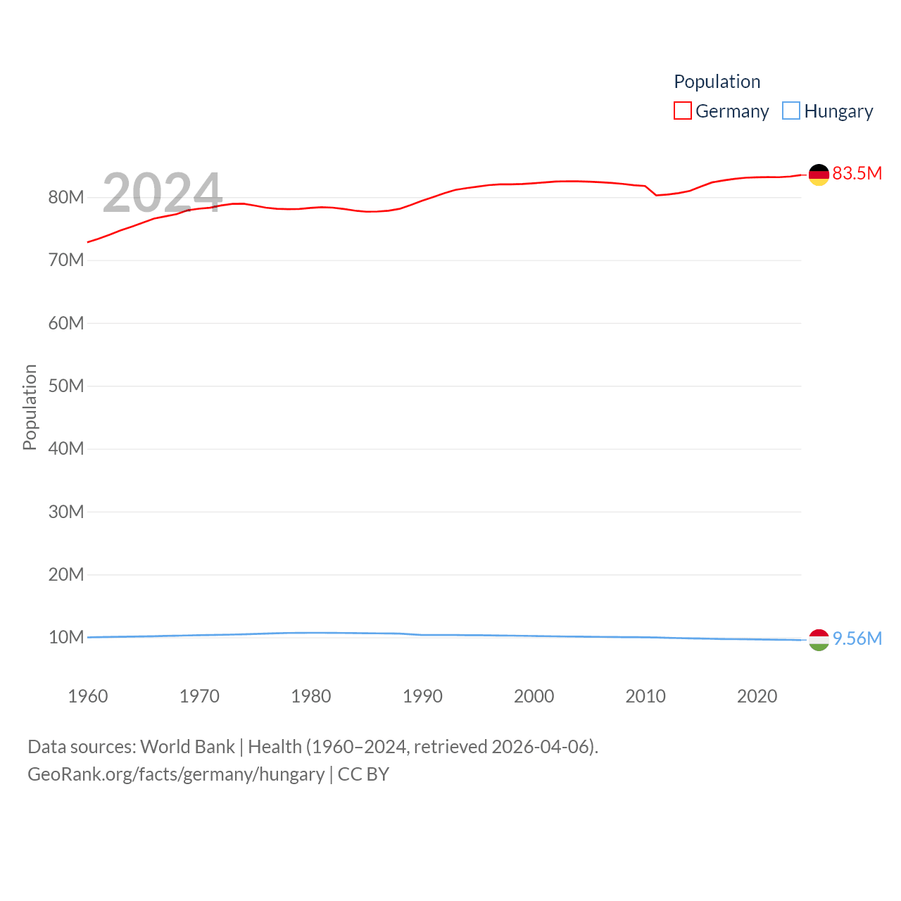 Germany has a population of 83.5M (ranked 19/197), compared with 9.56M in Hungary (ranked 97/197). Germany's land area is 134,916 sq mi versus 35,236 sq mi for Hungary (ranked 63rd vs. 109th).
