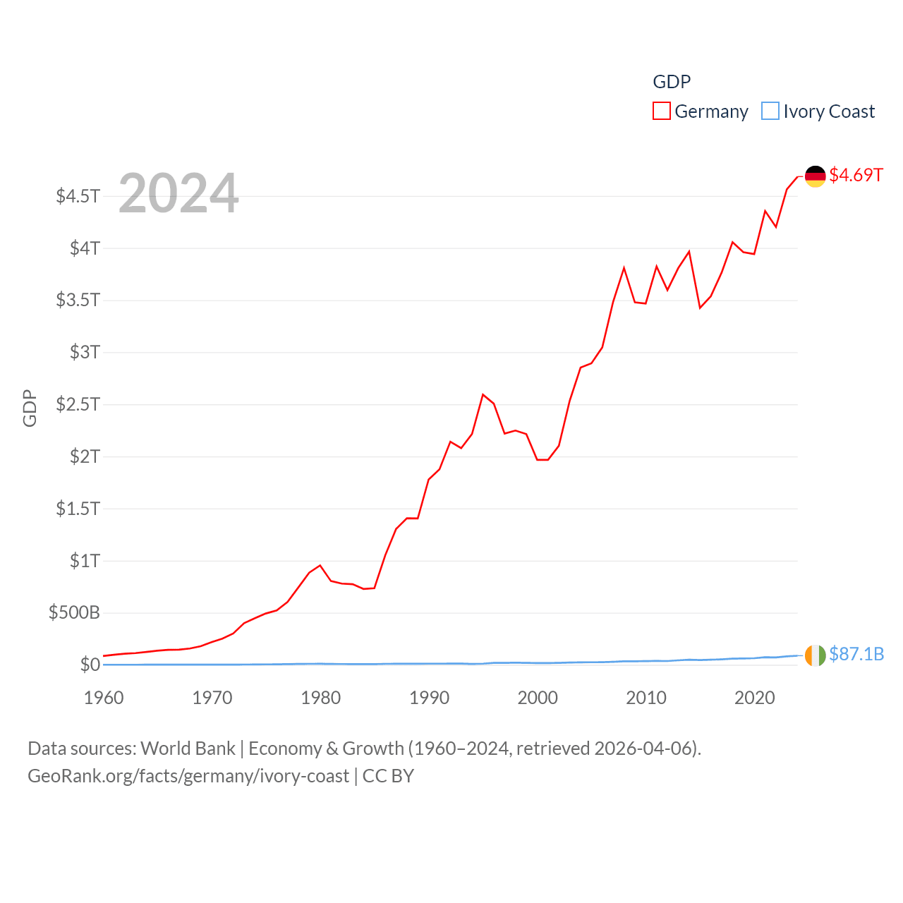 By GDP, Germany ranks 3/197 ($4.69T) and Ivory Coast ranks 77/197 ($87.1B). By GDP per capita, Germany ranks 19/197 ($56,104), while Ivory Coast ranks 142/197 ($2,728).