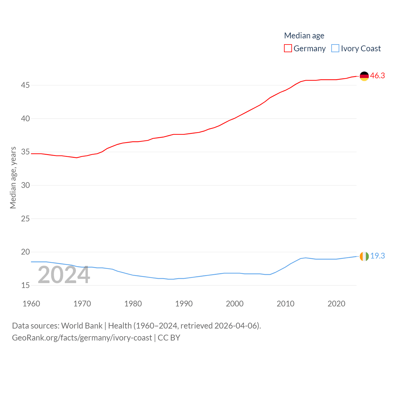Germany has a population of 83.5M (ranked 19/197), compared with 31.9M in Ivory Coast (ranked 50/197). Germany's land area is 134,916 sq mi versus 122,780 sq mi for Ivory Coast (ranked 63rd vs. 66th).