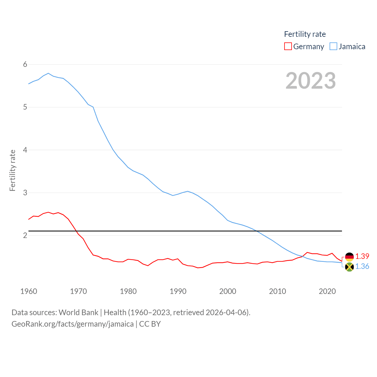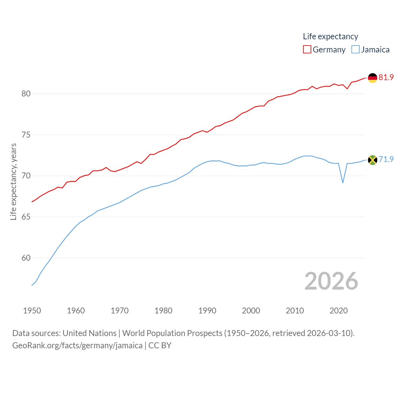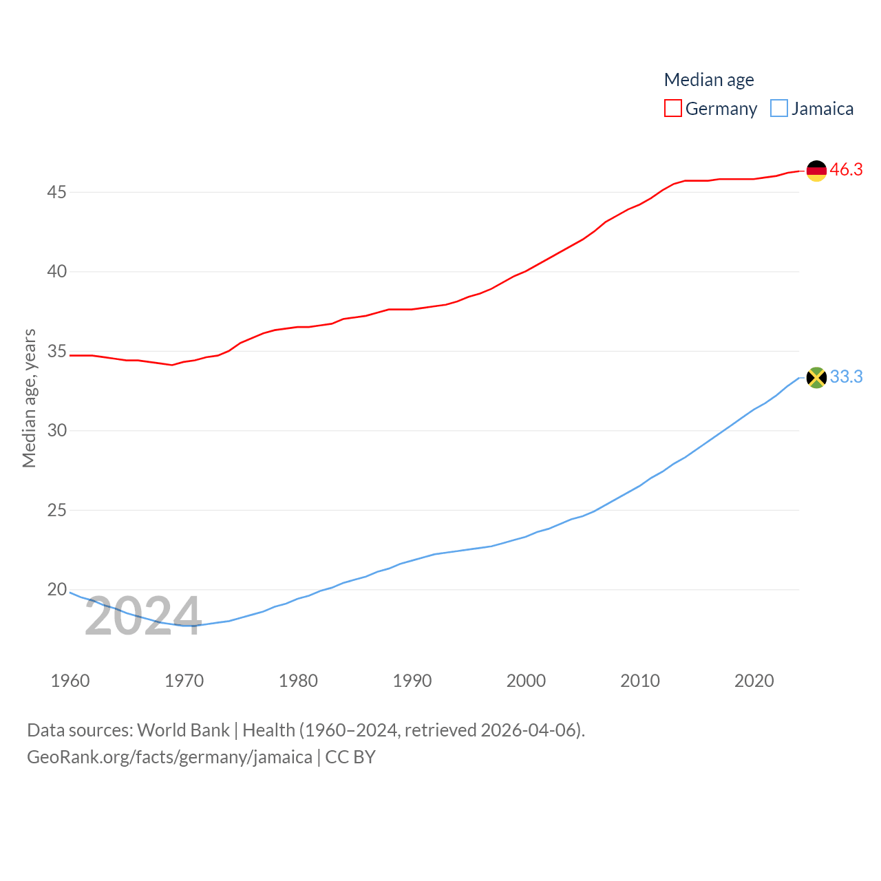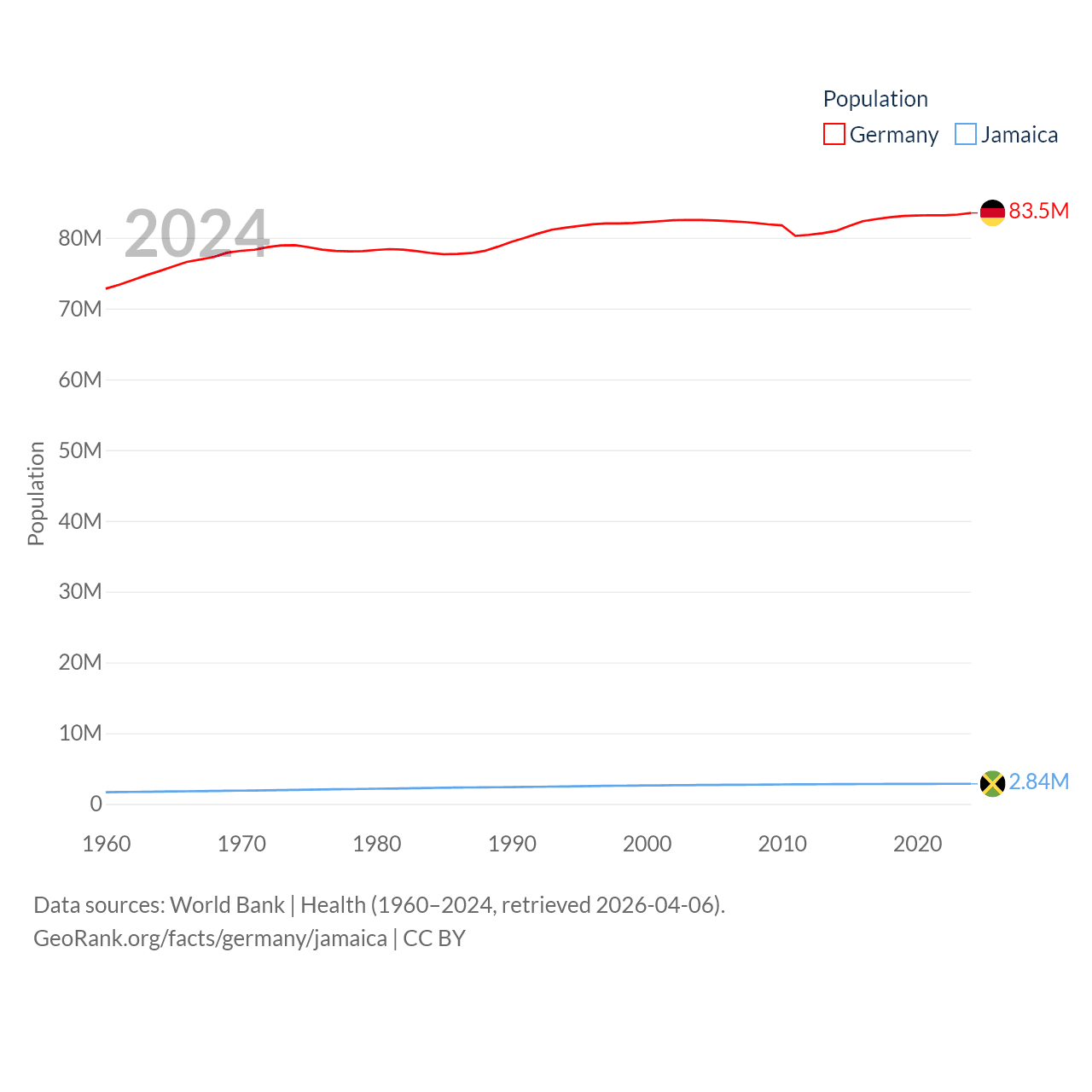 Germany has a population of 83.5M (ranked 19/197), compared with 2.84M in Jamaica (ranked 139/197). Germany's land area is 134,916 sq mi versus 4,181 sq mi for Jamaica (ranked 63rd vs. 159th).