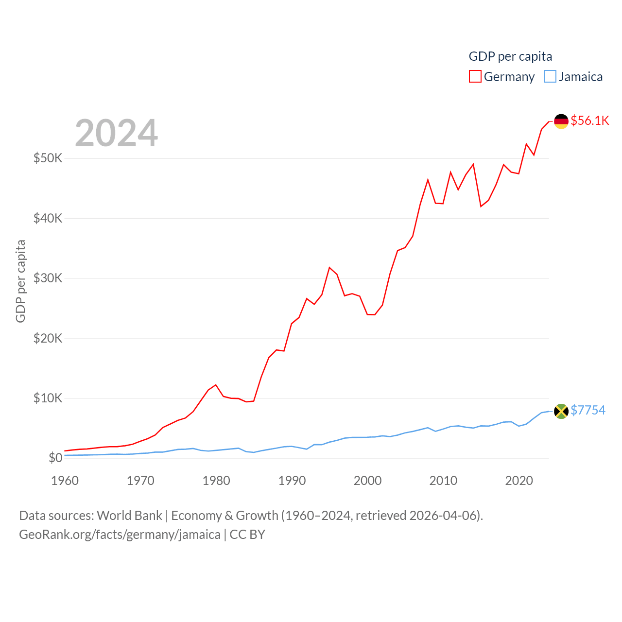 By GDP, Germany ranks 3/197 ($4.69T) and Jamaica ranks 124/197 ($22B). By GDP per capita, Germany ranks 19/197 ($56,104), while Jamaica ranks 95/197 ($7,754).