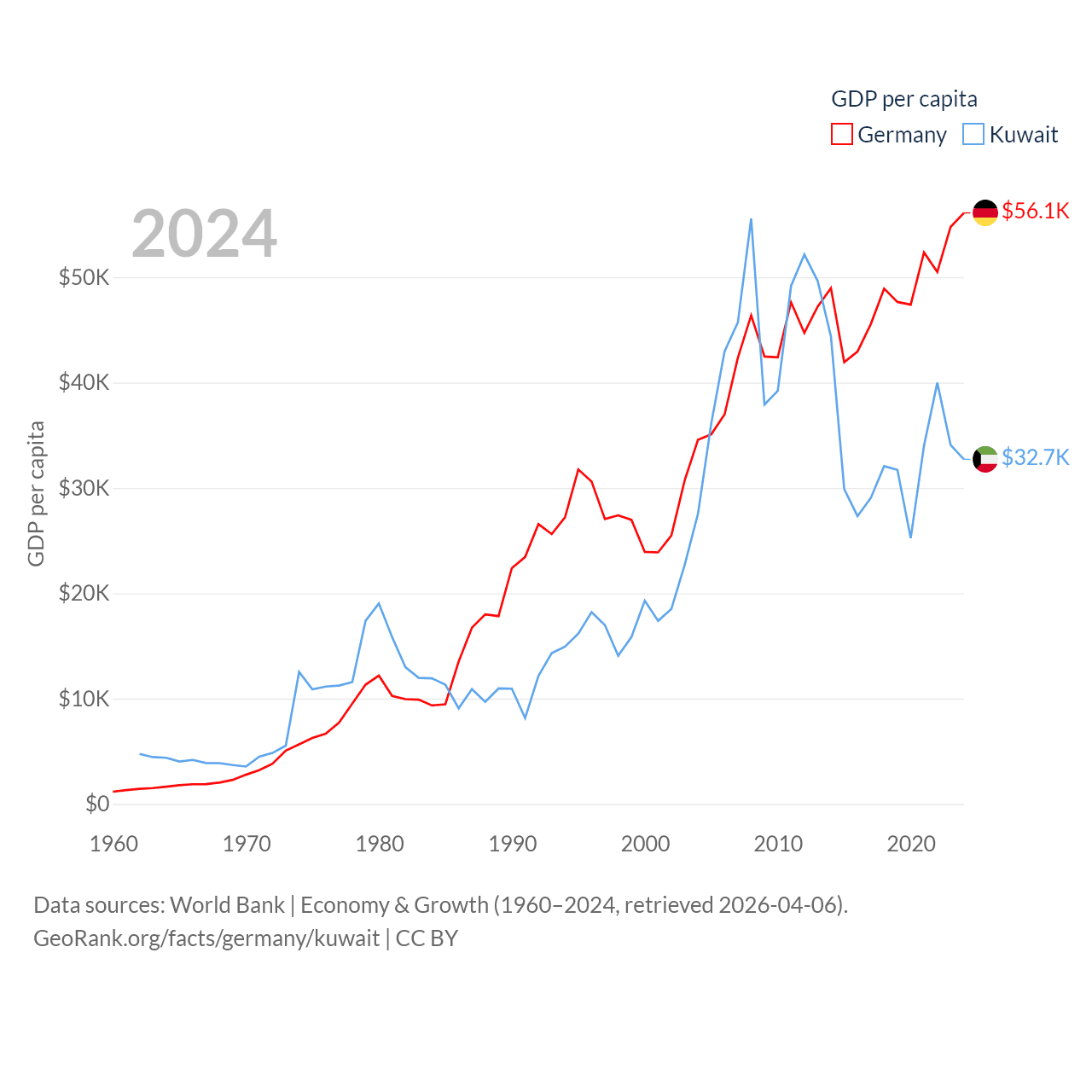 By GDP, Germany ranks 3/197 ($4.69T) and Kuwait ranks 59/197 ($160B). By GDP per capita, Germany ranks 19/197 ($56,104), while Kuwait ranks 37/197 ($32,718).