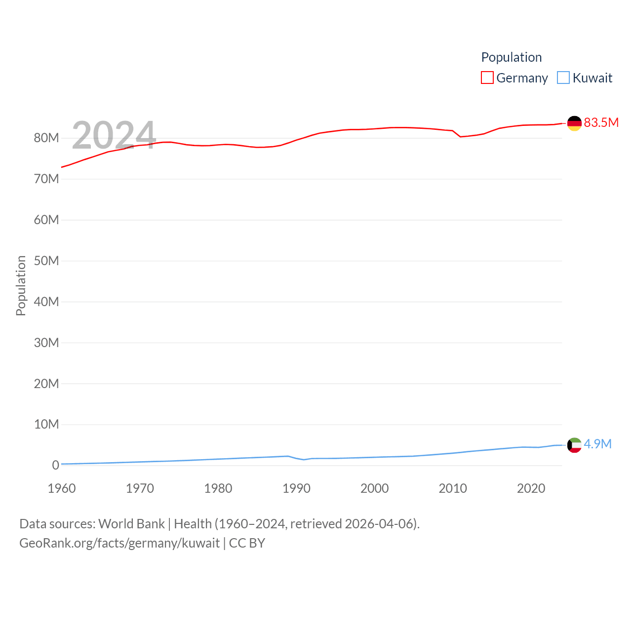 Germany has a population of 83.5M (ranked 19/197), compared with 4.9M in Kuwait (ranked 127/197). Germany's land area is 134,916 sq mi versus 6,880 sq mi for Kuwait (ranked 63rd vs. 153rd).