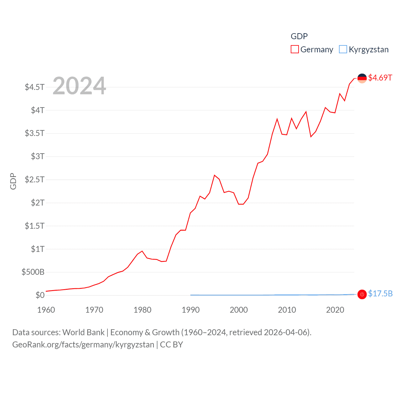 By GDP, Germany ranks 3/197 ($4.69T) and Kyrgyzstan ranks 135/197 ($17.5B). By GDP per capita, Germany ranks 19/197 ($56,104), while Kyrgyzstan ranks 150/197 ($2,420).