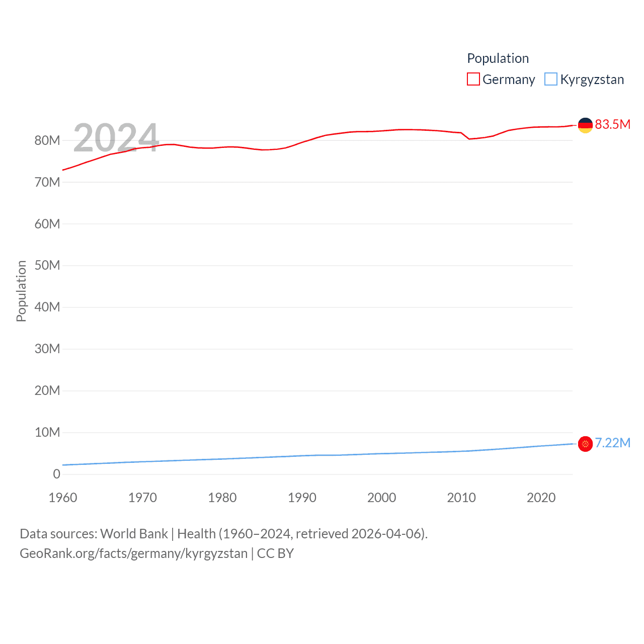 Germany has a population of 83.5M (ranked 19/197), compared with 7.22M in Kyrgyzstan (ranked 106/197). Germany's land area is 134,916 sq mi versus 74,054 sq mi for Kyrgyzstan (ranked 63rd vs. 86th).