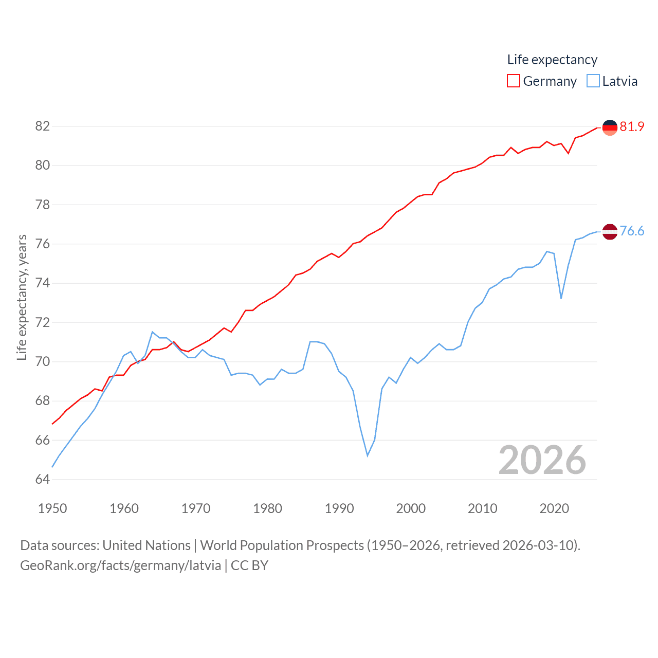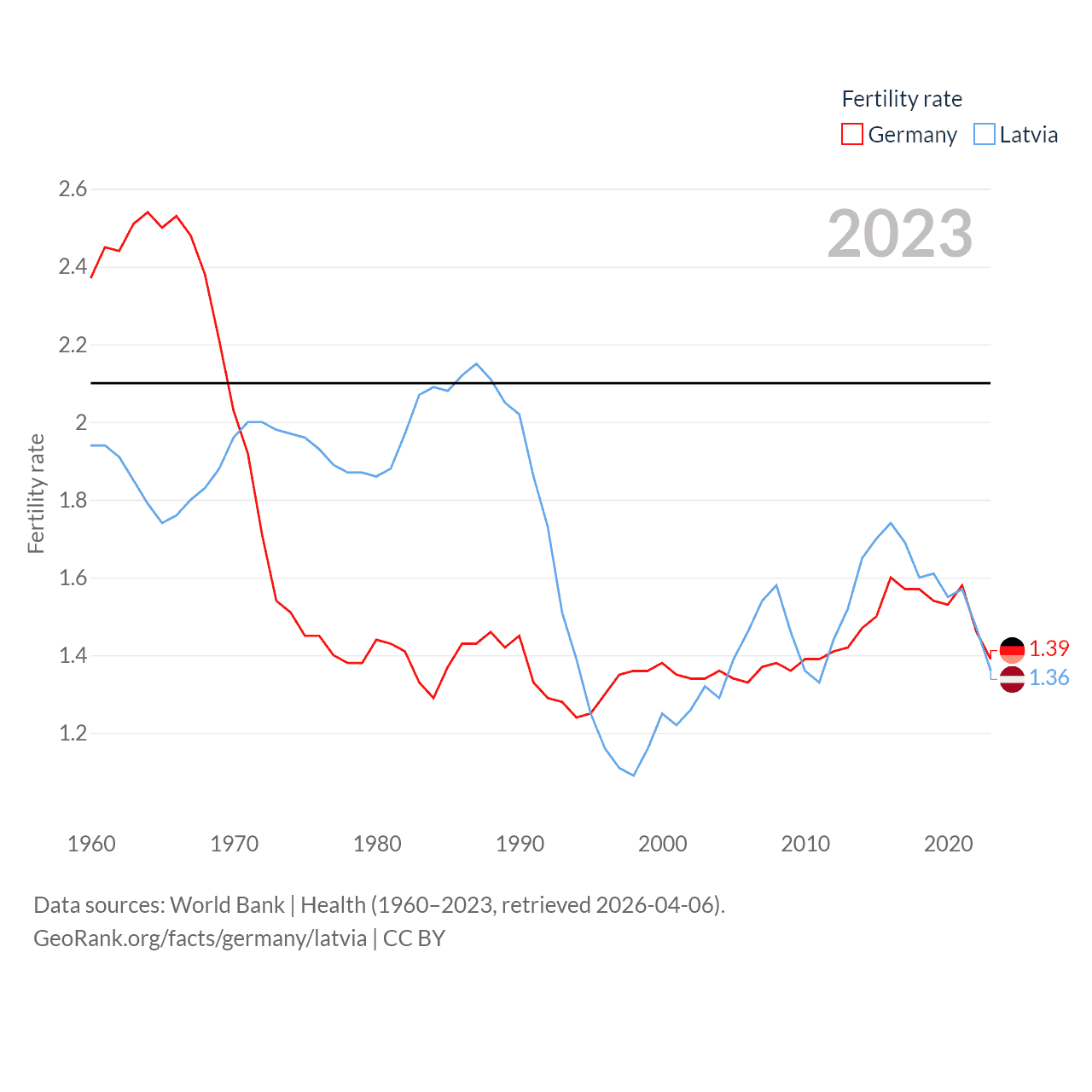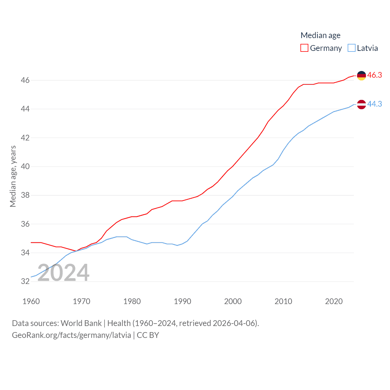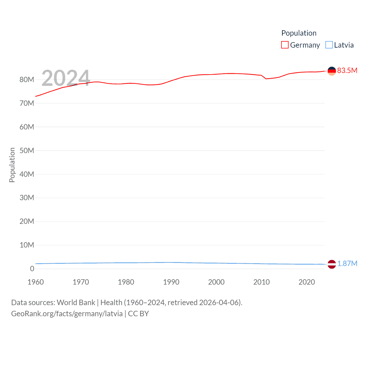 Germany has a population of 83.5M (ranked 19/197), compared with 1.87M in Latvia (ranked 149/197). Germany's land area is 134,916 sq mi versus 24,027 sq mi for Latvia (ranked 63rd vs. 121st).