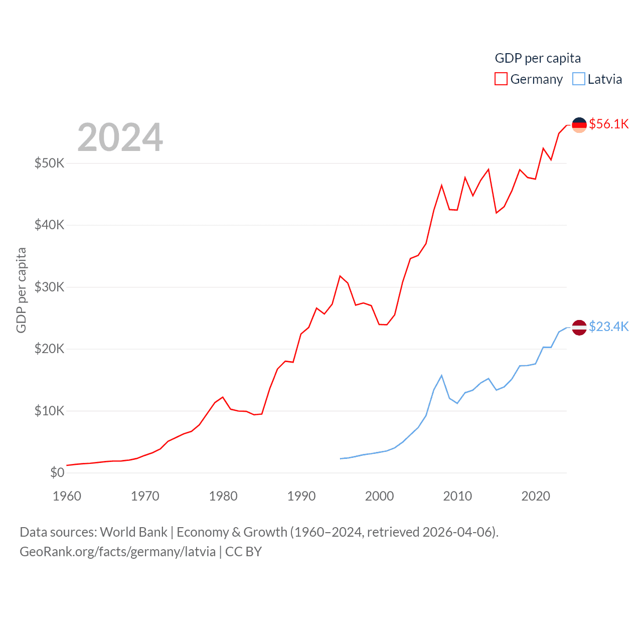 By GDP, Germany ranks 3/197 ($4.69T) and Latvia ranks 99/197 ($43.7B). By GDP per capita, Germany ranks 19/197 ($56,104), while Latvia ranks 54/197 ($23,409).