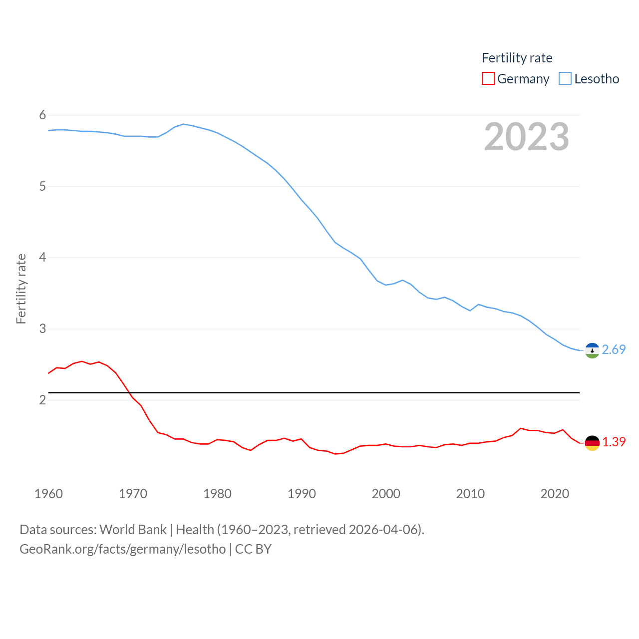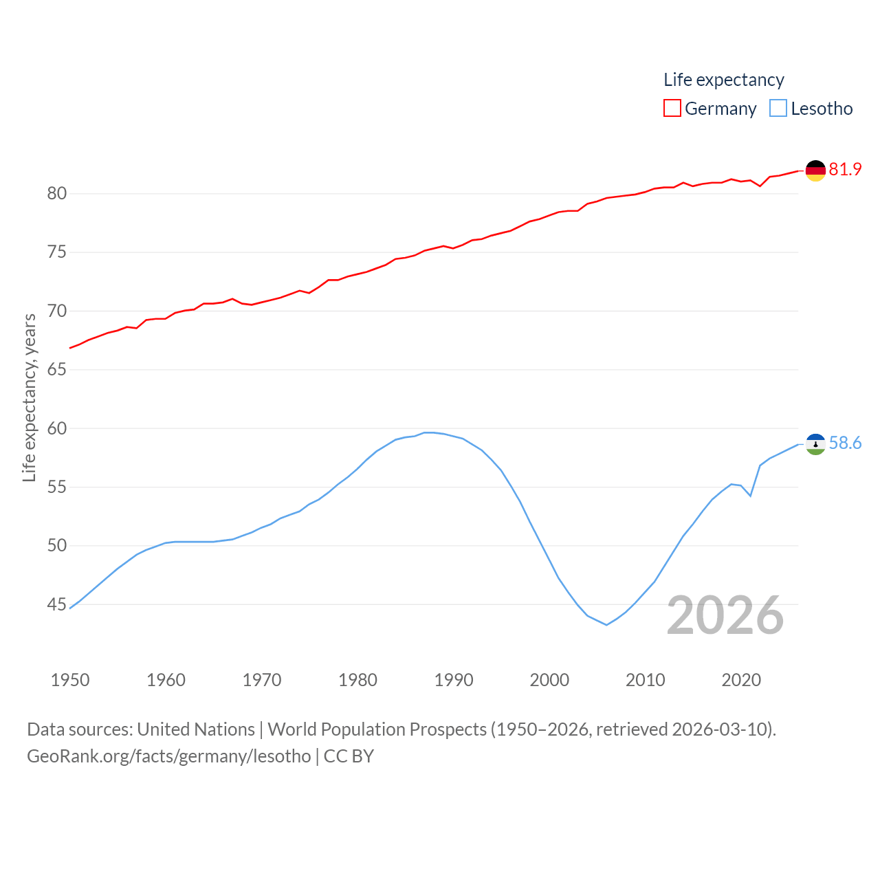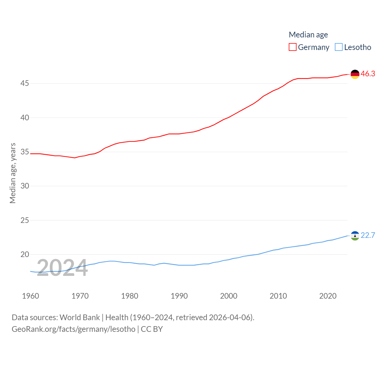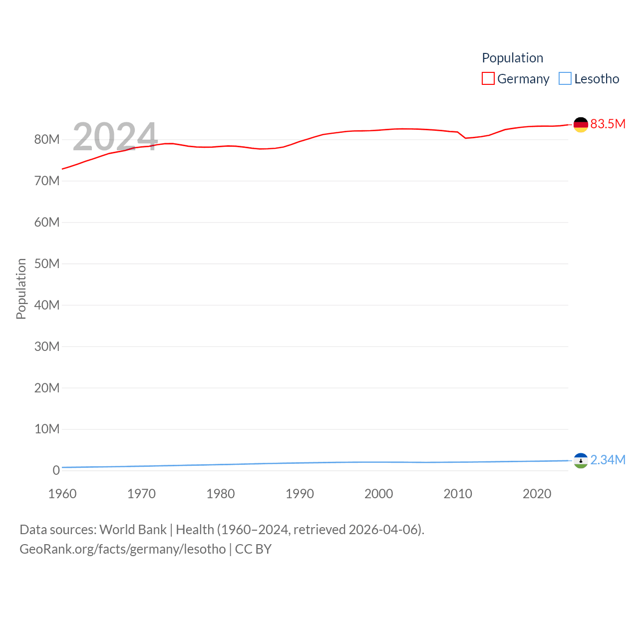 Germany has a population of 83.5M (ranked 19/197), compared with 2.34M in Lesotho (ranked 145/197). Germany's land area is 134,916 sq mi versus 11,722 sq mi for Lesotho (ranked 63rd vs. 137th).
