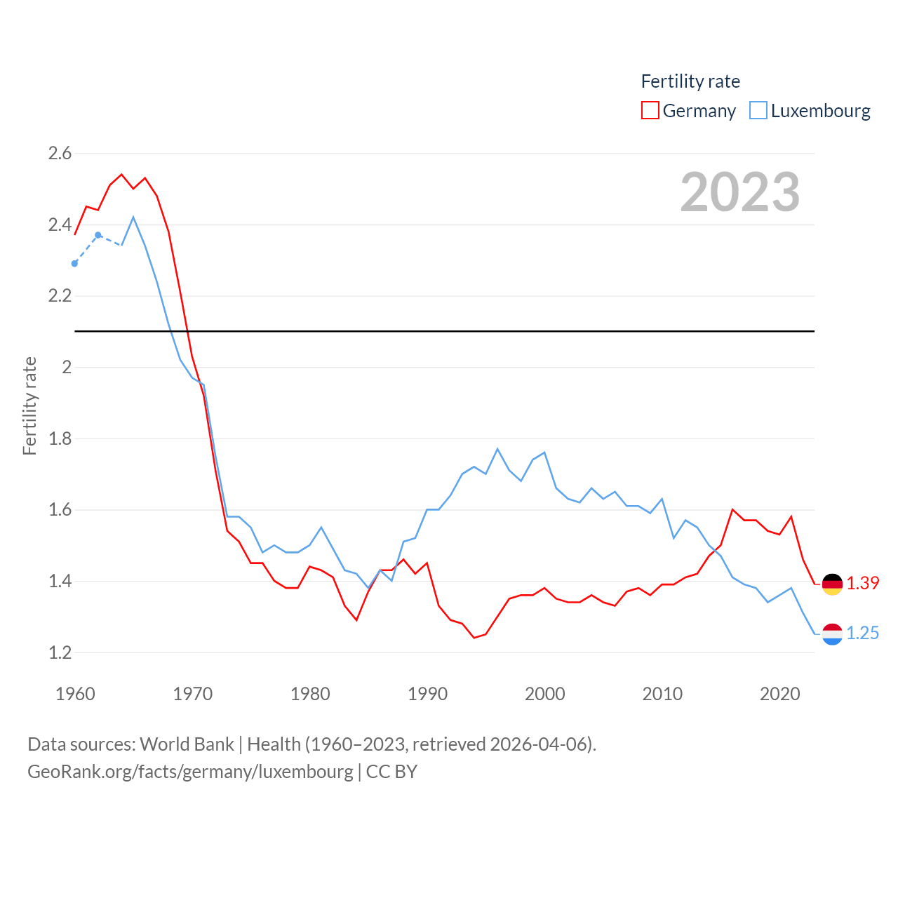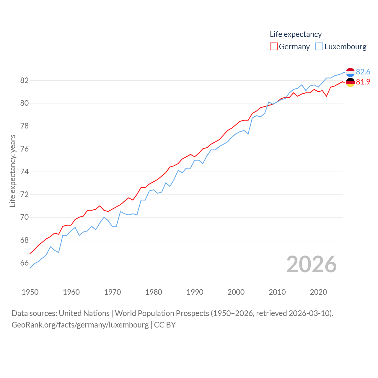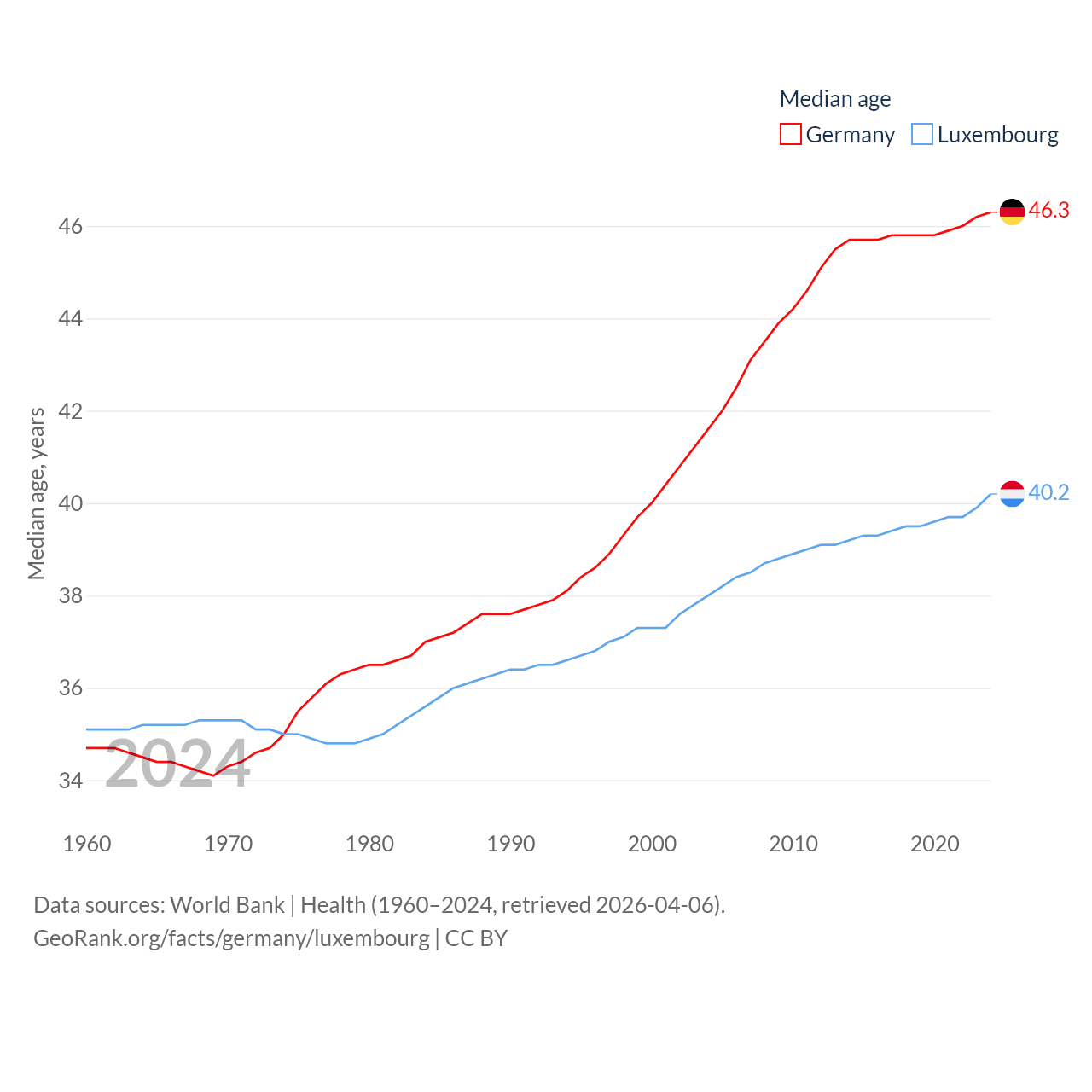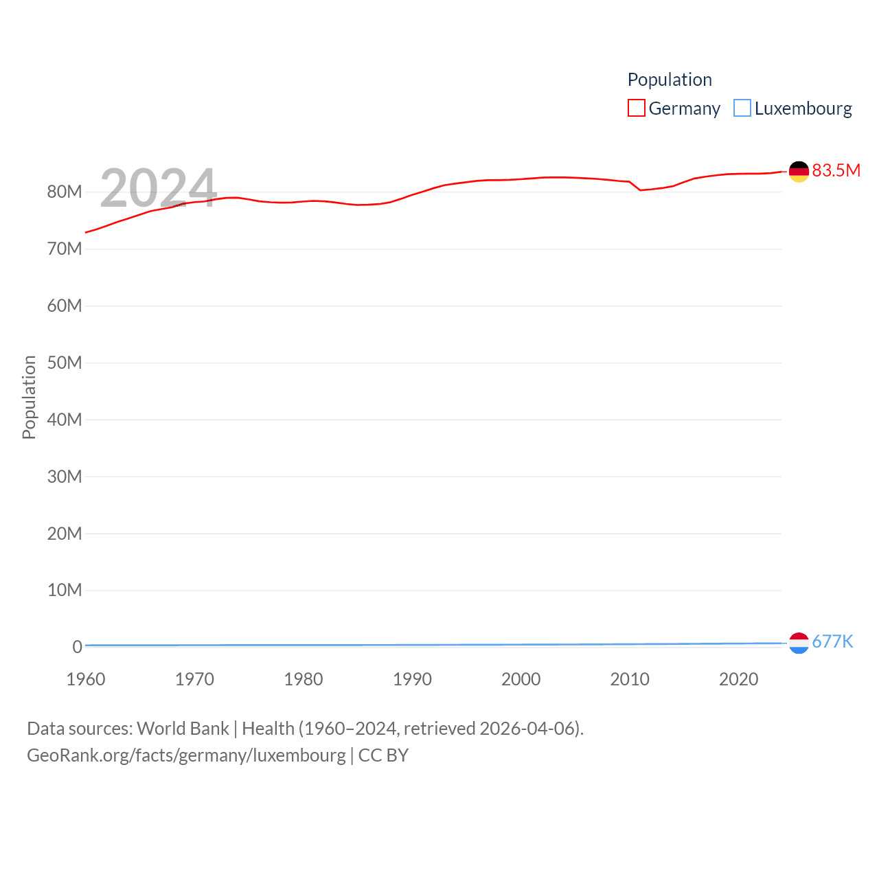 Germany has a population of 83.5M (ranked 19/197), compared with 677K in Luxembourg (ranked 164/197). Germany's land area is 134,916 sq mi versus 994 sq mi for Luxembourg (ranked 63rd vs. 169th).
