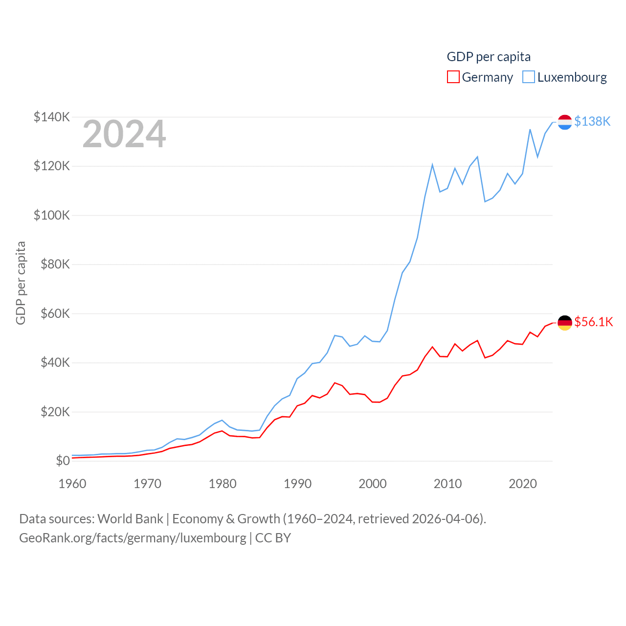 By GDP, Germany ranks 3/197 ($4.69T) and Luxembourg ranks 74/197 ($93.3B). By GDP per capita, Germany ranks 19/197 ($56,104), while Luxembourg ranks 3/197 ($137,782).