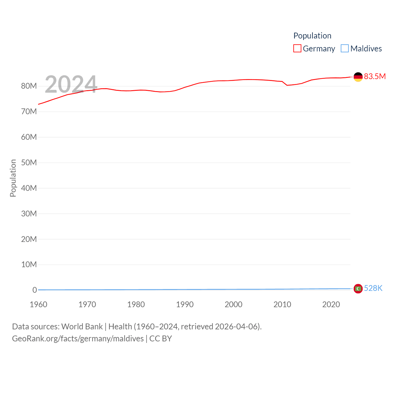 Germany has a population of 83.5M (ranked 19/197), compared with 528K in Maldives (ranked 168/197). Germany's land area is 134,916 sq mi versus 115.1 sq mi for Maldives (ranked 63rd vs. 188th).
