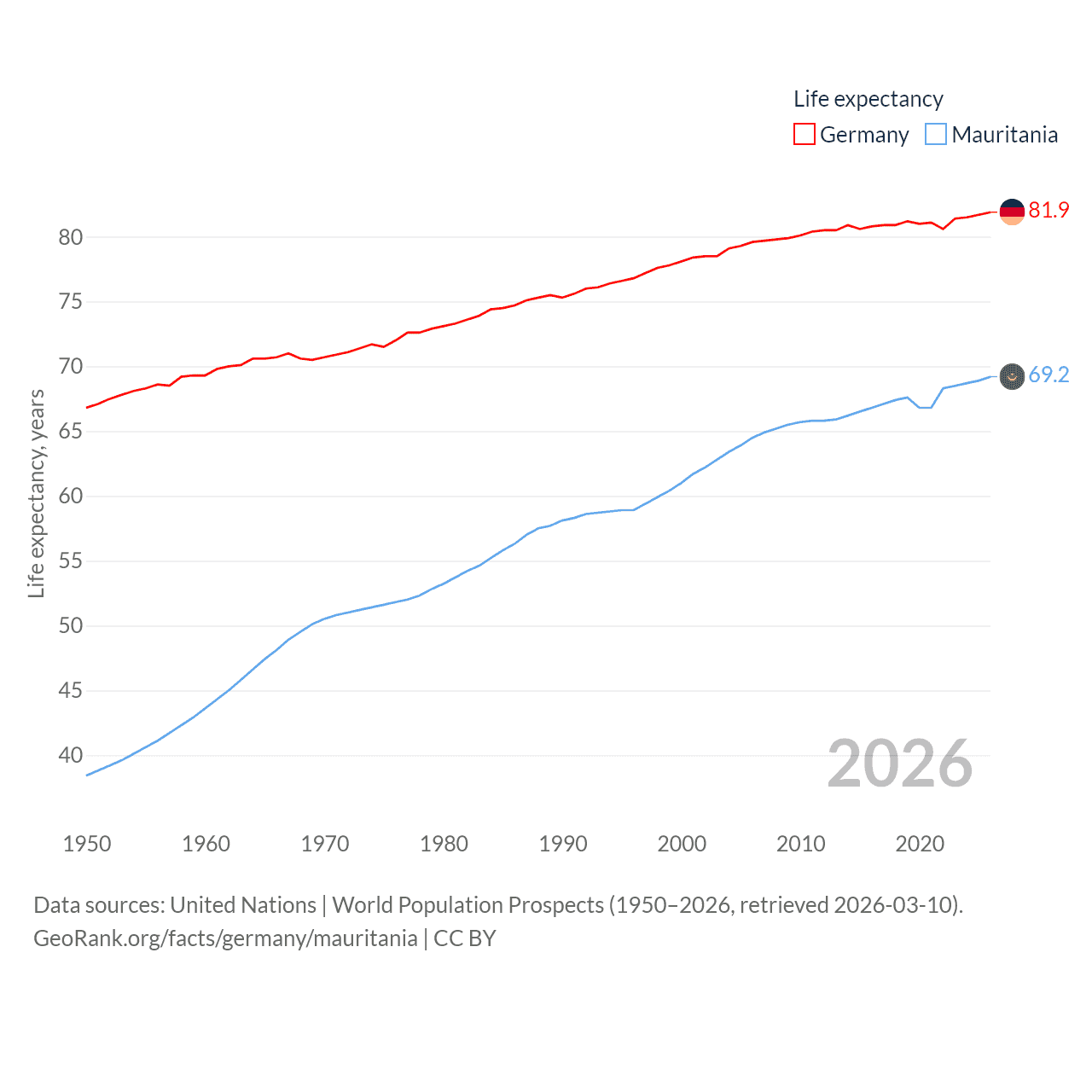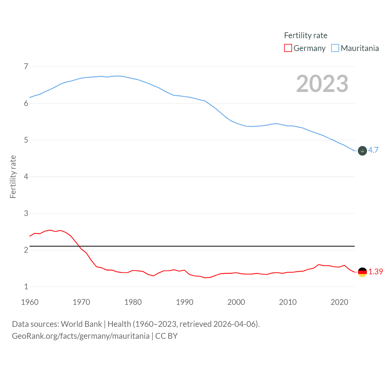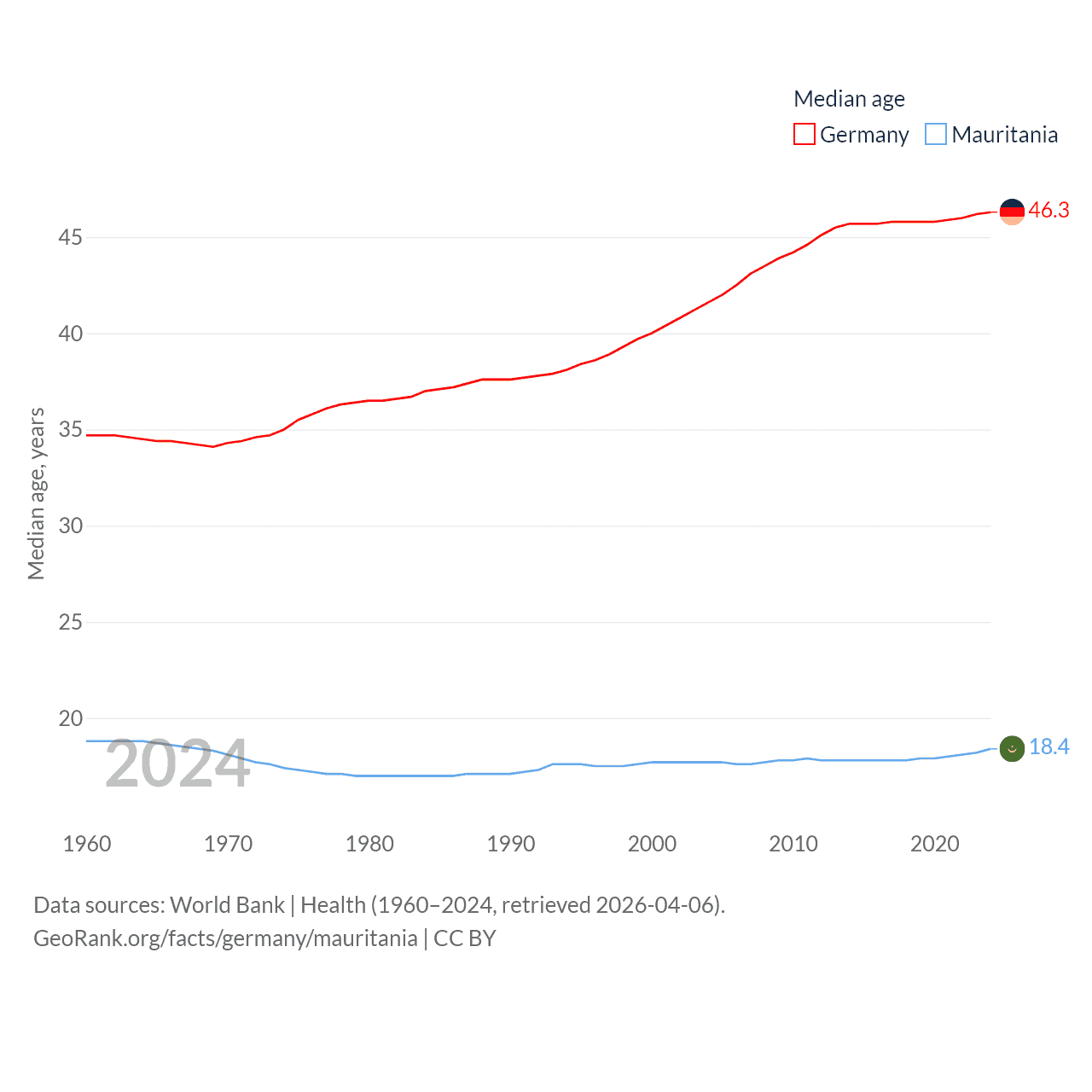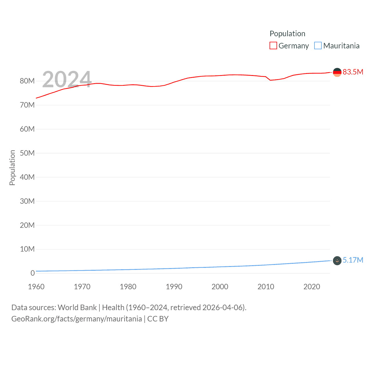 Germany has a population of 83.5M (ranked 19/197), compared with 5.17M in Mauritania (ranked 125/197). Germany's land area is 134,916 sq mi versus 397,955 sq mi for Mauritania (ranked 63rd vs. 28th).