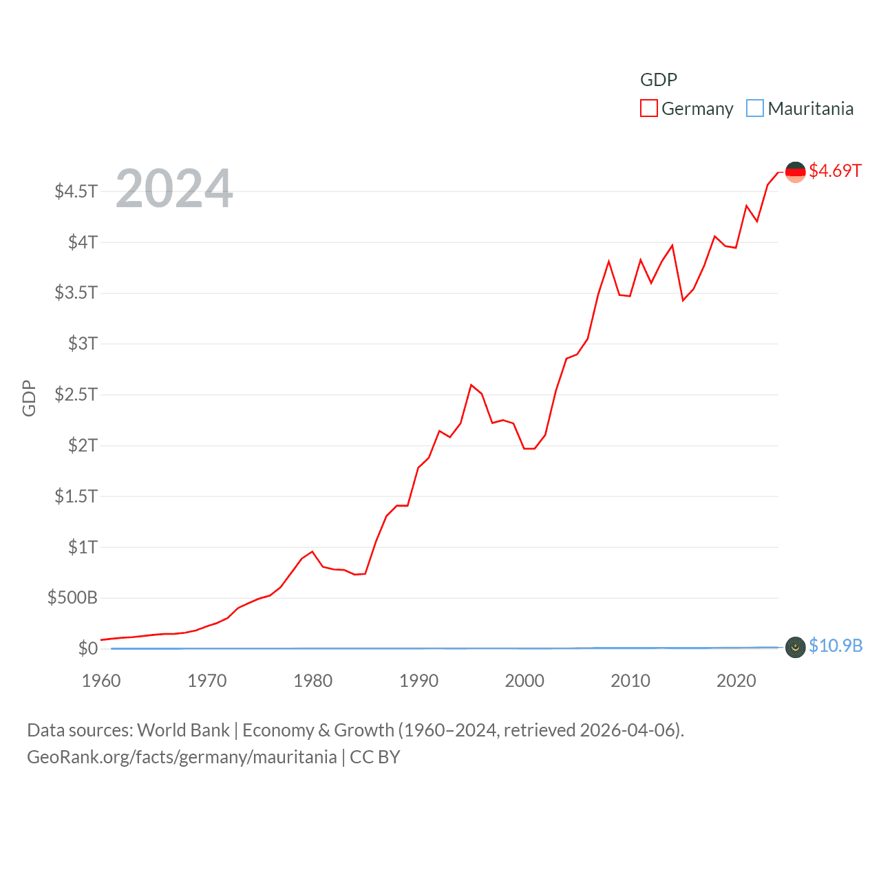 By GDP, Germany ranks 3/197 ($4.69T) and Mauritania ranks 153/197 ($10.9B). By GDP per capita, Germany ranks 19/197 ($56,104), while Mauritania ranks 156/197 ($2,110).