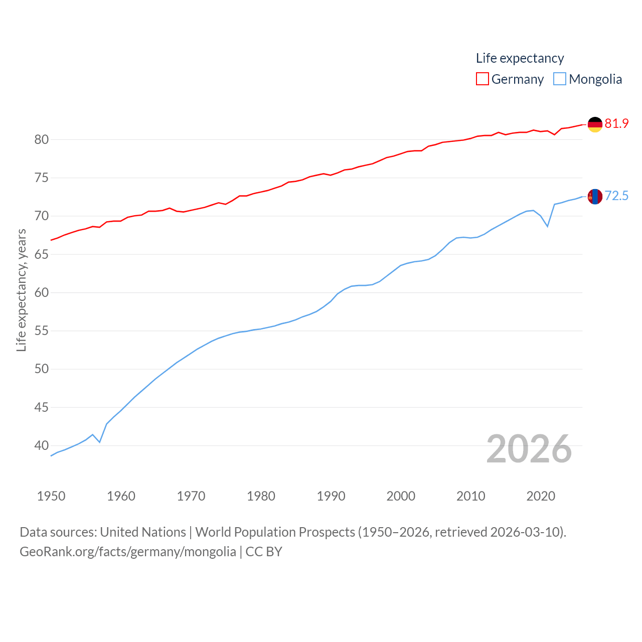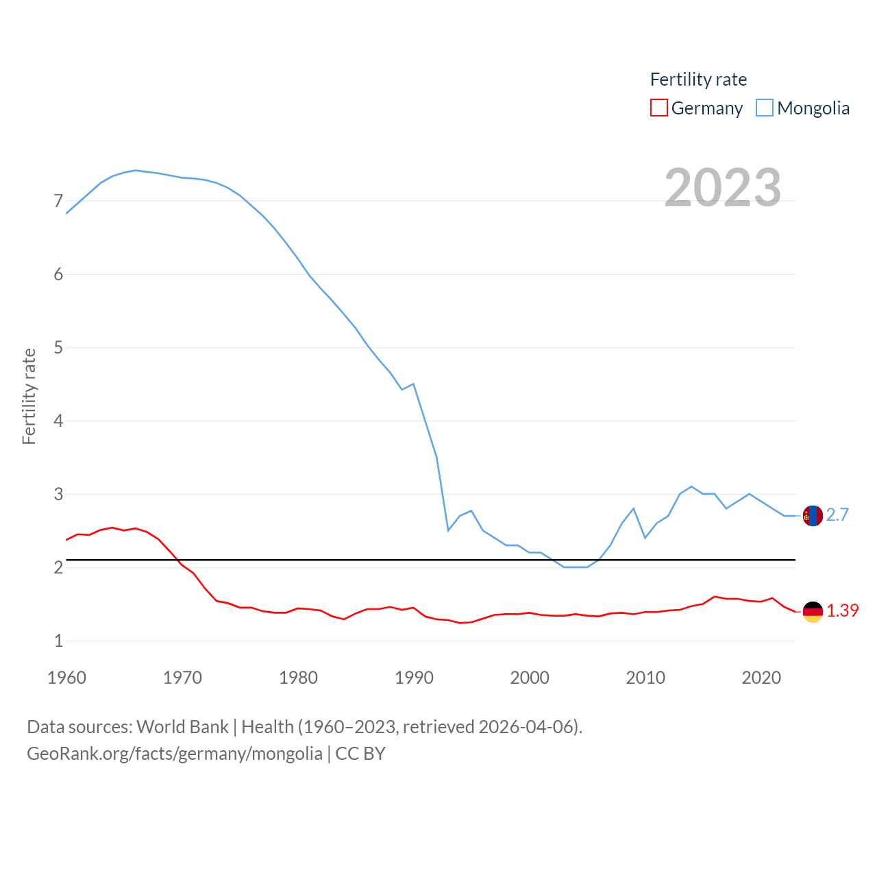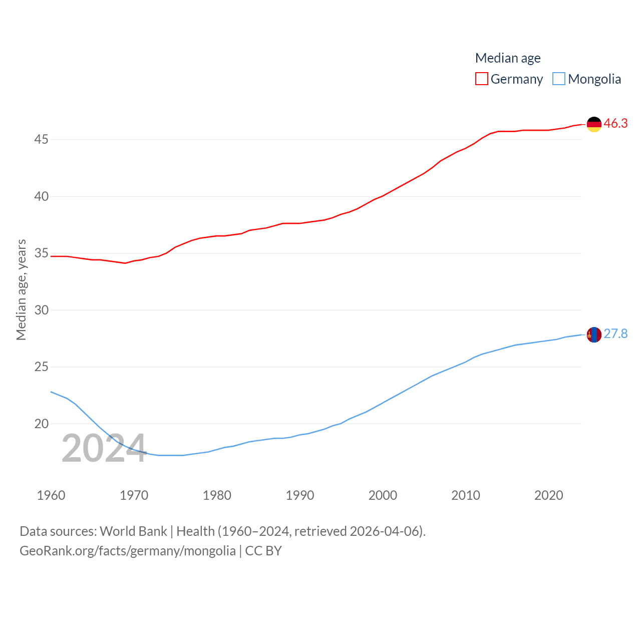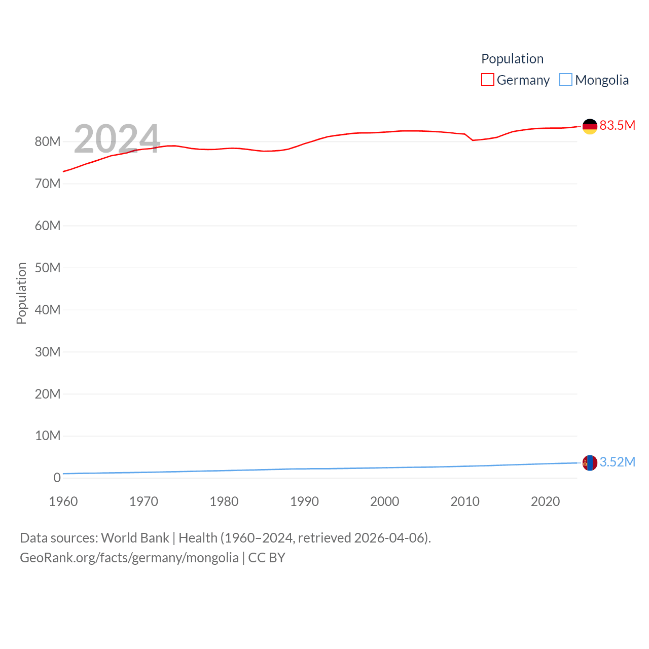 Germany has a population of 83.5M (ranked 19/197), compared with 3.52M in Mongolia (ranked 132/197). Germany's land area is 134,916 sq mi versus 601,740 sq mi for Mongolia (ranked 63rd vs. 18th).