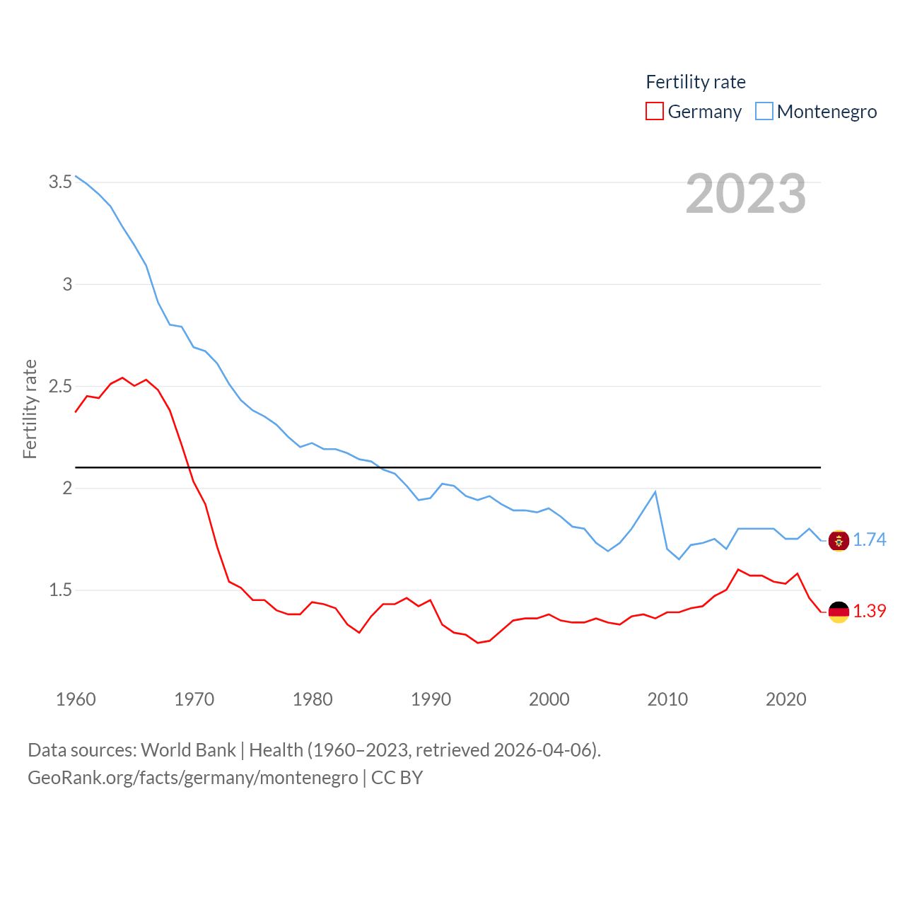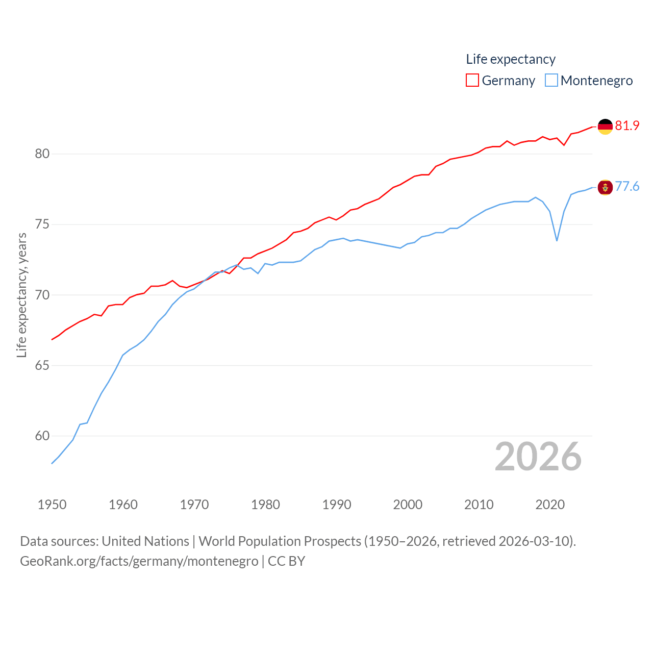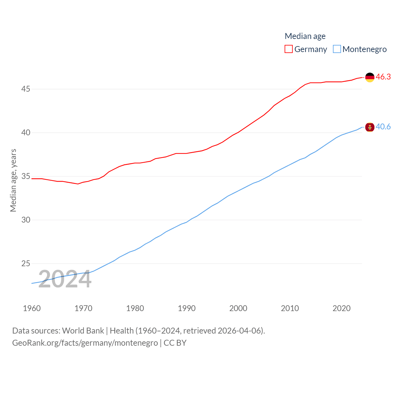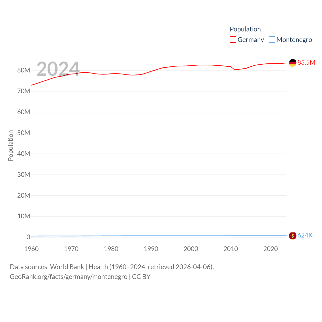 Germany has a population of 83.5M (ranked 19/197), compared with 624K in Montenegro (ranked 166/197). Germany's land area is 134,916 sq mi versus 5,193 sq mi for Montenegro (ranked 63rd vs. 156th).