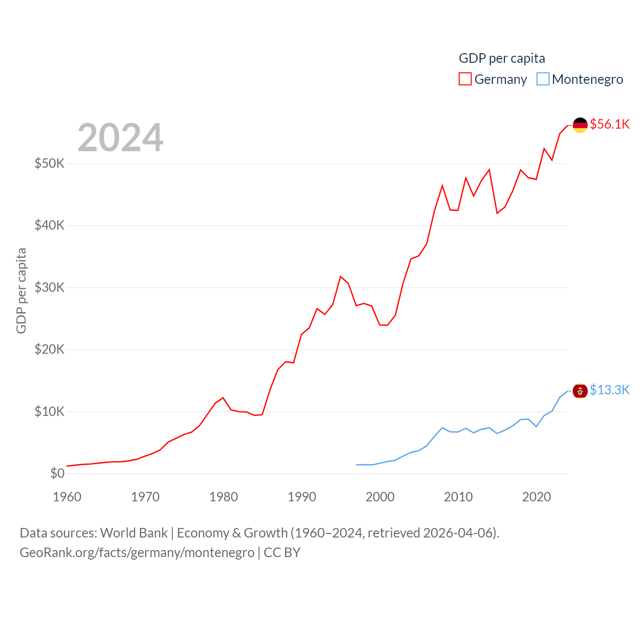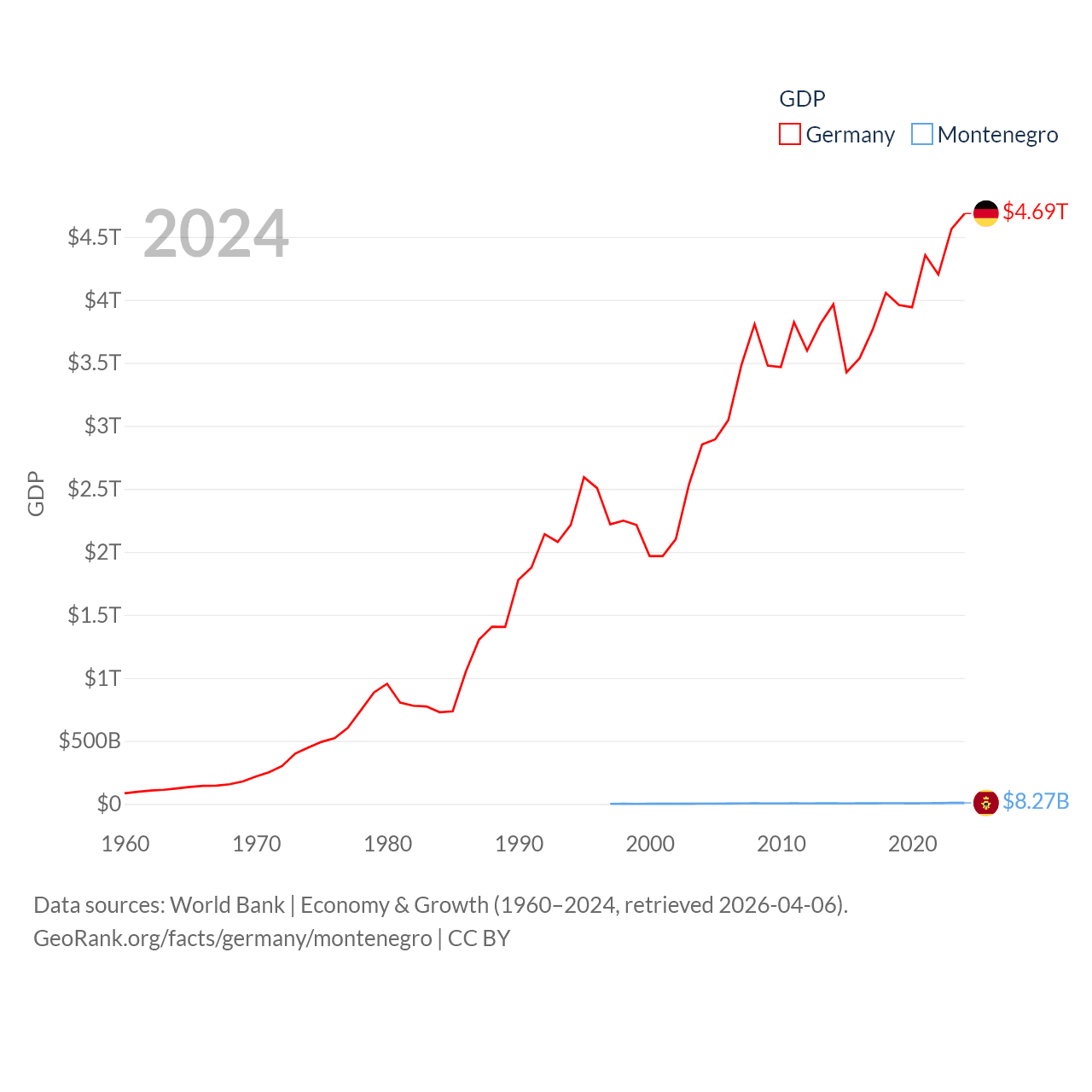 By GDP, Germany ranks 3/197 ($4.69T) and Montenegro ranks 155/197 ($8.27B). By GDP per capita, Germany ranks 19/197 ($56,104), while Montenegro ranks 77/197 ($13,263).