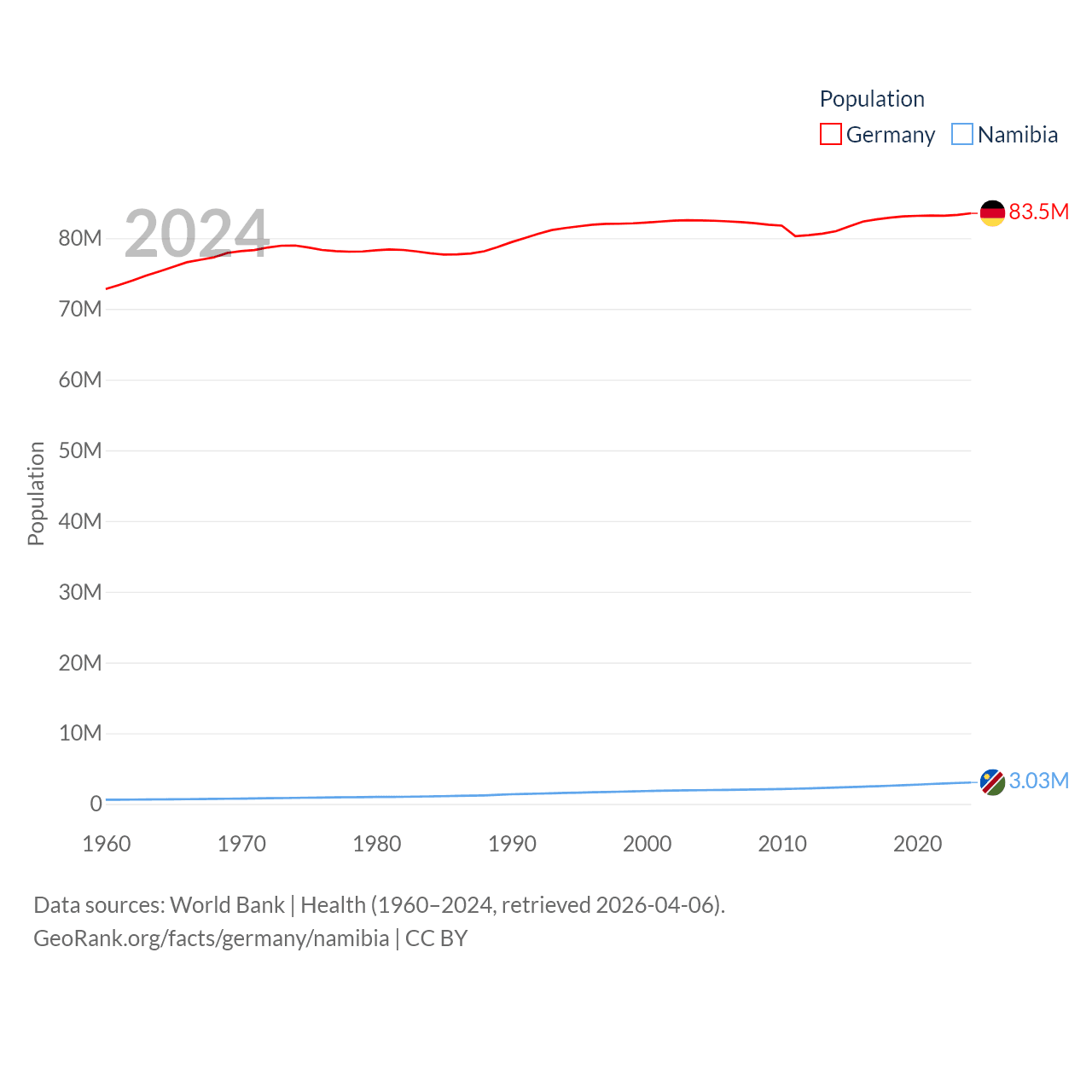 Germany has a population of 83.5M (ranked 19/197), compared with 3.03M in Namibia (ranked 136/197). Germany's land area is 134,916 sq mi versus 317,874 sq mi for Namibia (ranked 63rd vs. 33rd).