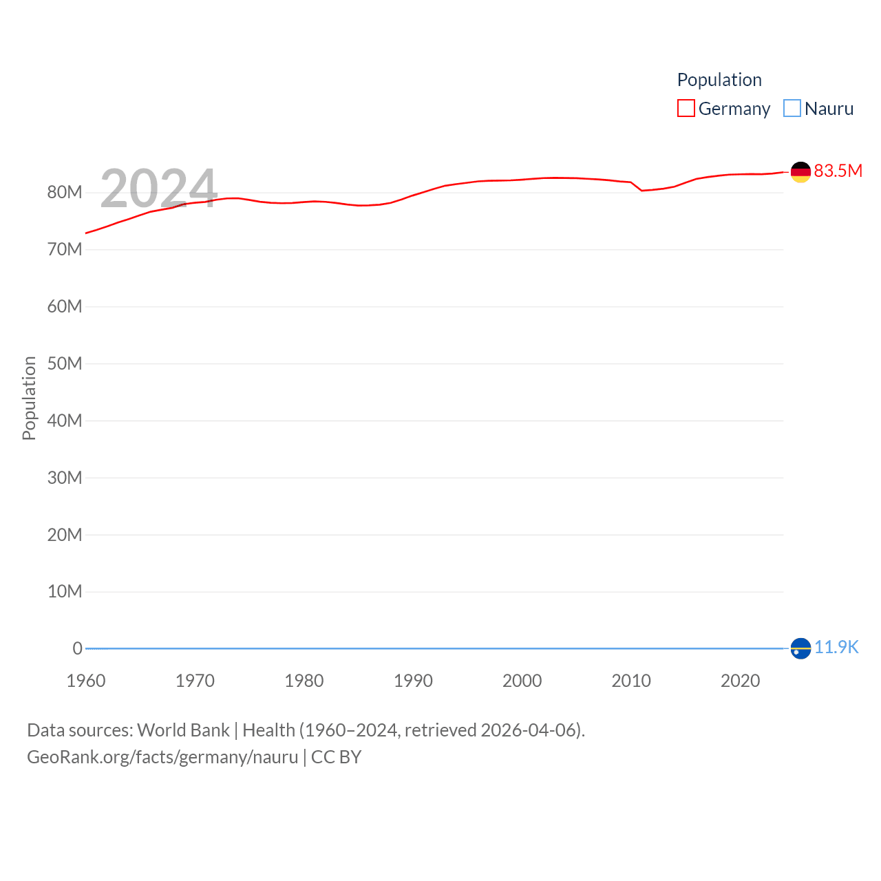 Germany has a population of 83.5M (ranked 19/197), compared with 11.9K in Nauru (ranked 195/197). Germany's land area is 134,916 sq mi versus 7.72 sq mi for Nauru (ranked 63rd vs. 195th).