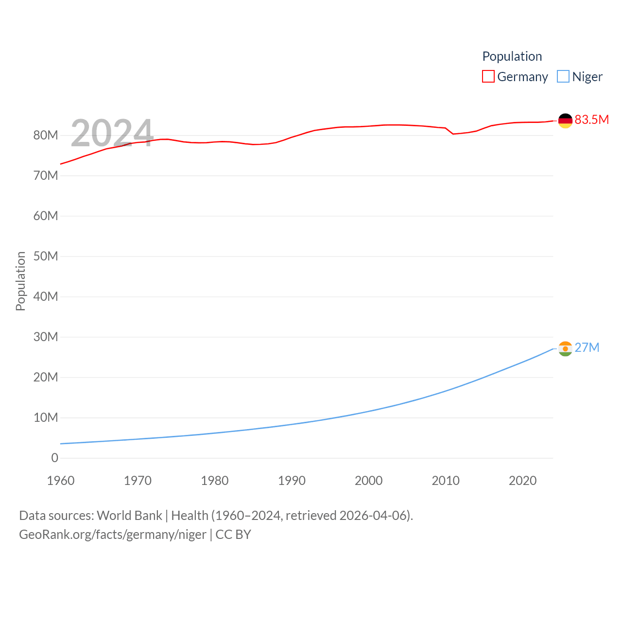 Germany has a population of 83.5M (ranked 19/197), compared with 27M in Niger (ranked 55/197). Germany's land area is 134,916 sq mi versus 489,076 sq mi for Niger (ranked 63rd vs. 20th).